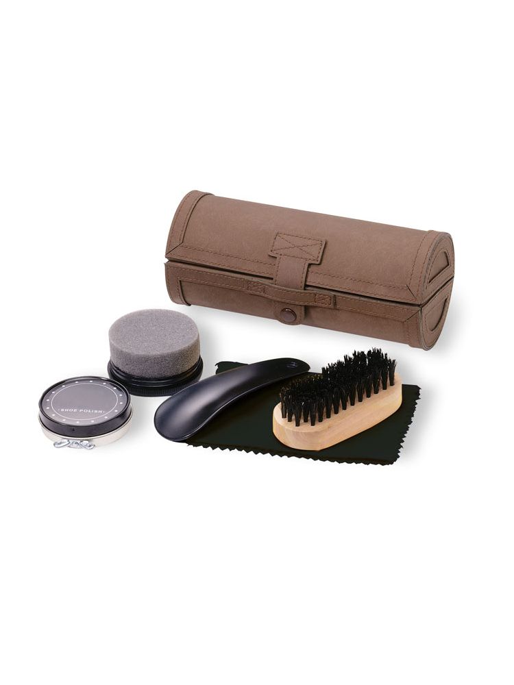 Luksusowy zestawu do butów w pudełku upominkowym, 5 cześci. Zestaw zawiera czarną ściereczkę do butów, czarną łyżkę do butów, drewnianą szczotkę do butów, gąbkę do nabłyszczania i pastę w neutralnym kolorze.