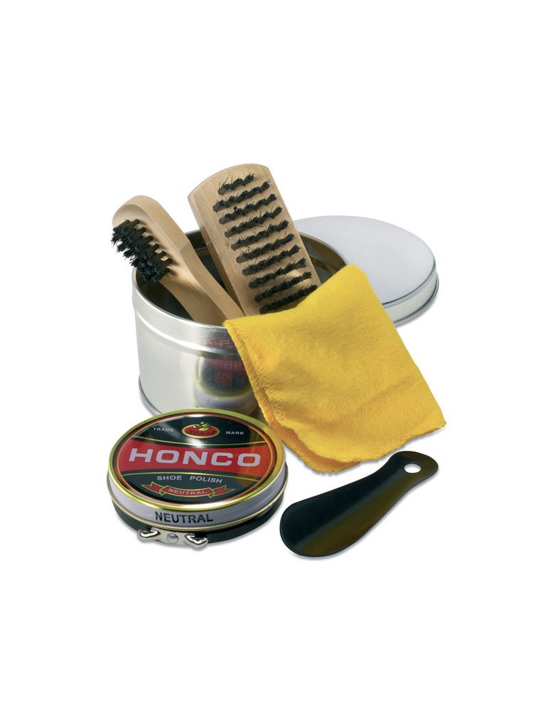 5-częściowy zestawu do pielęgnacji butów w metalowym pudełku upominkowym. Zestaw zawiera żółtą ściereczkę do polerowania, łyżkę do butów, dużą szczotkę, małą szczotkę do mniejszych detali oraz pastę w neutralnym kolorze.