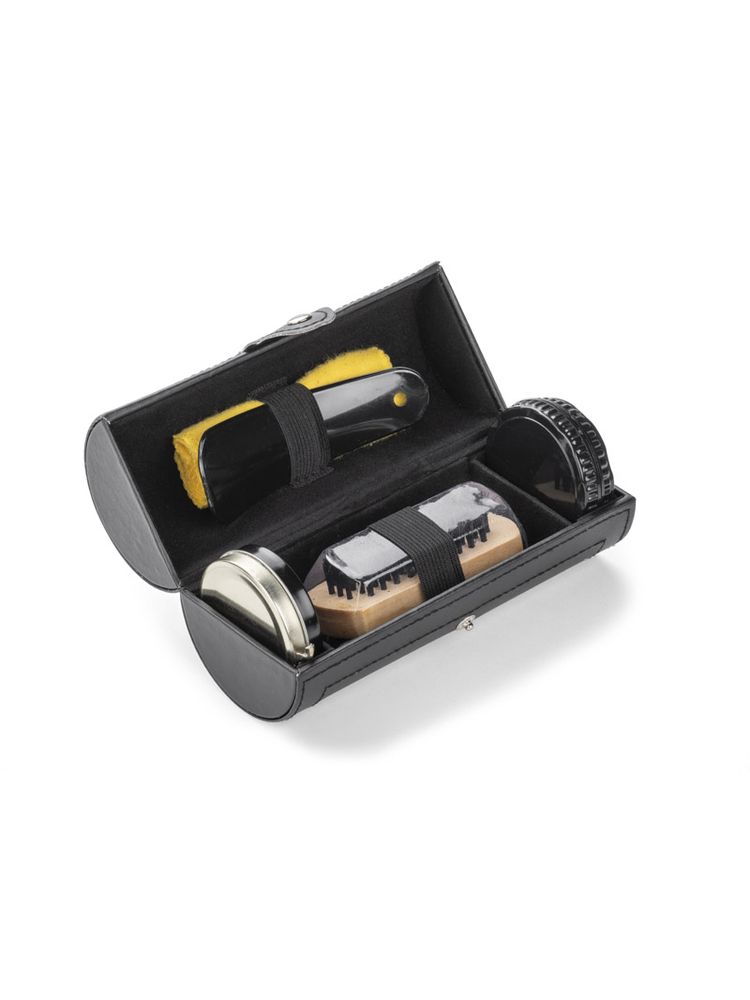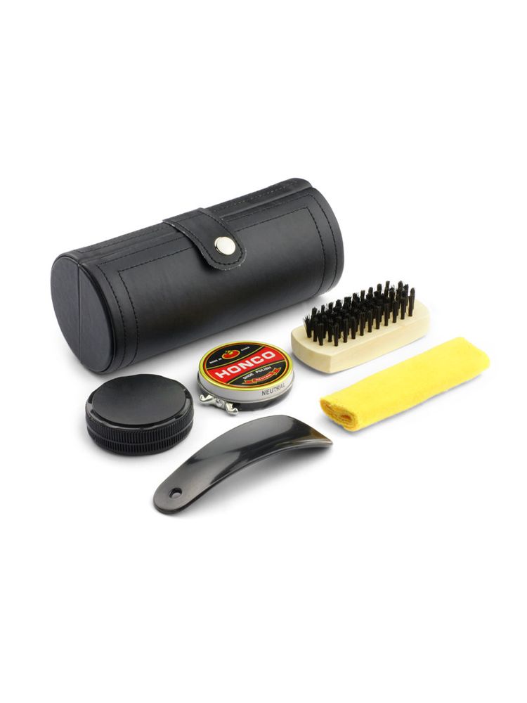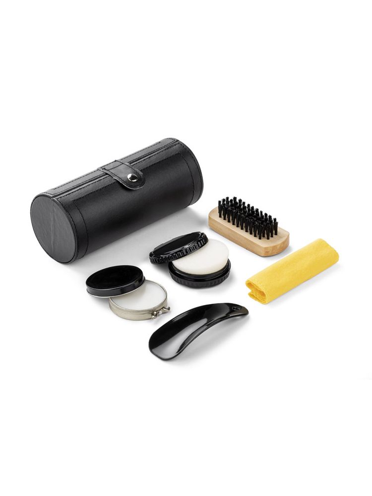Wszechstronny zestaw do czyszczenia obuwia wykonany z ekoskóry PU. Zawiera pastę bezbarwną, czyścik, łyżkę do butów, ściereczkę i szczotkę. Logo umieścimy na tubie.