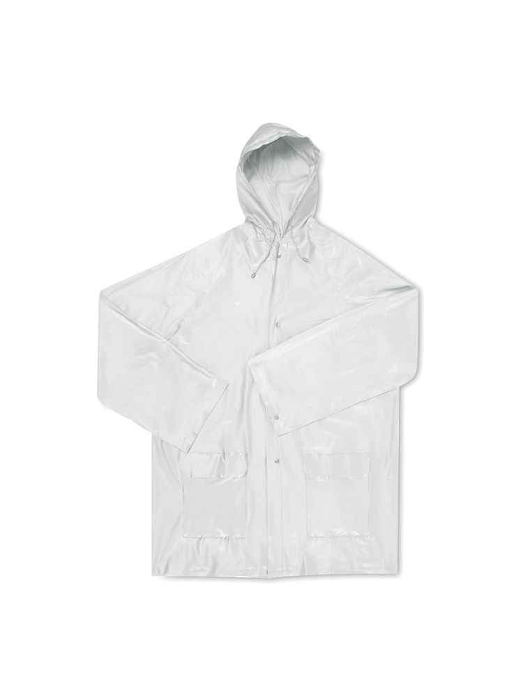 Płaszcz przeciwdeszczowy z materiału PEVA, z kapturem i kieszeniami z klapą, w nylonowym etui.