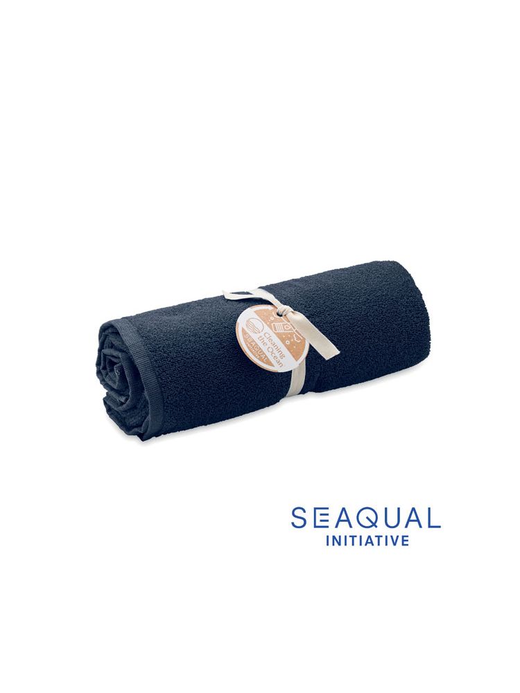 Ekologiczny żakardowy ręcznik kąpielowy lub plażowy z recyklingu. 70% bawełna z recyklingu i 30% poliester SEAQUAL® z recyklingu. 500 gr/m². 70×140 cm. INICJATYWA SEAQUAL współpracuje z organizacjami sprzątającymi oceany na całym świecie, aby nadać wartość odzyskiwanym odpadom. Wyprodukowano w UE.