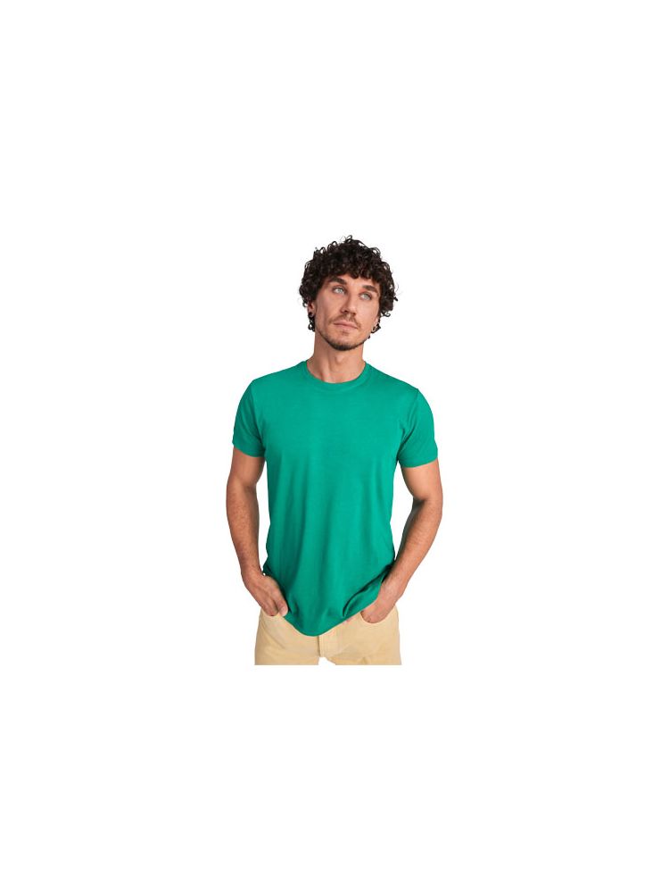 Koszulka z materiału rurkowego z krótkim rękawem. Prążkowany dekolt 1×1 z wewnętrznymi krytymi szwami.