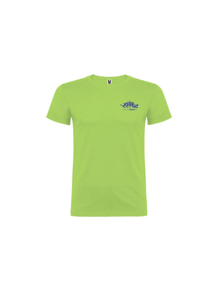 T-shirt z krótkim rękawem. Podwójna tkanina z dodatkiem elastanu przy kołnierzu. Wzmocnione, kryte szwy na karczku. Brak szwów bocznych w wersji dla dorosłych. Usuwalna metka.