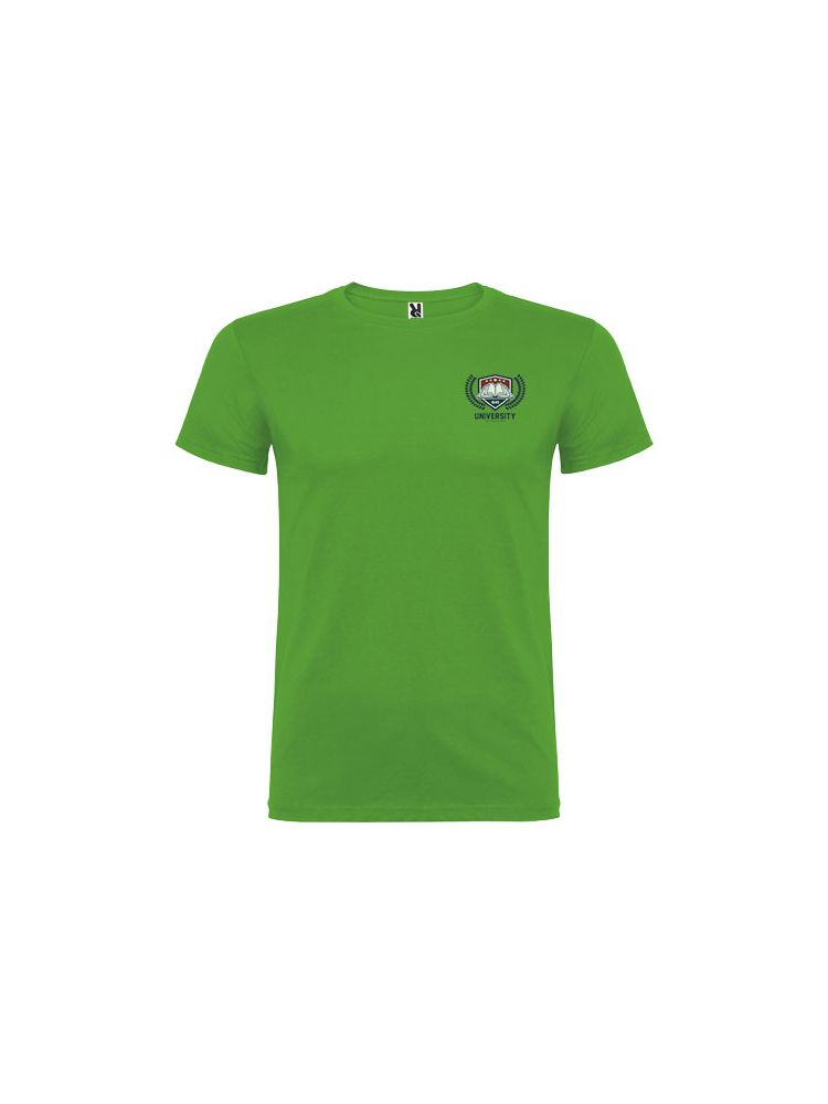 T-shirt z krótkim rękawem. Podwójna tkanina z dodatkiem elastanu przy kołnierzu. Wzmocnione, kryte szwy na karczku. Brak szwów bocznych w wersji dla dorosłych. Usuwalna metka.