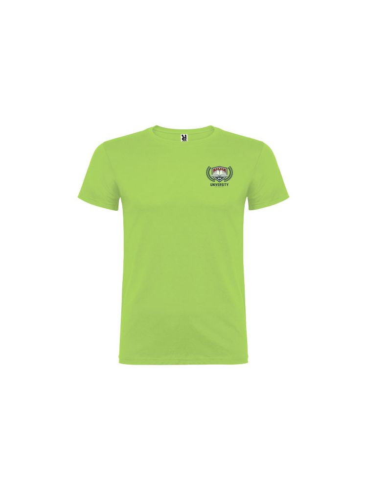 T-shirt z krótkim rękawem. Podwójna tkanina z dodatkiem elastanu przy kołnierzu. Wzmocnione, kryte szwy na karczku. Brak szwów bocznych w wersji dla dorosłych. Usuwalna metka.