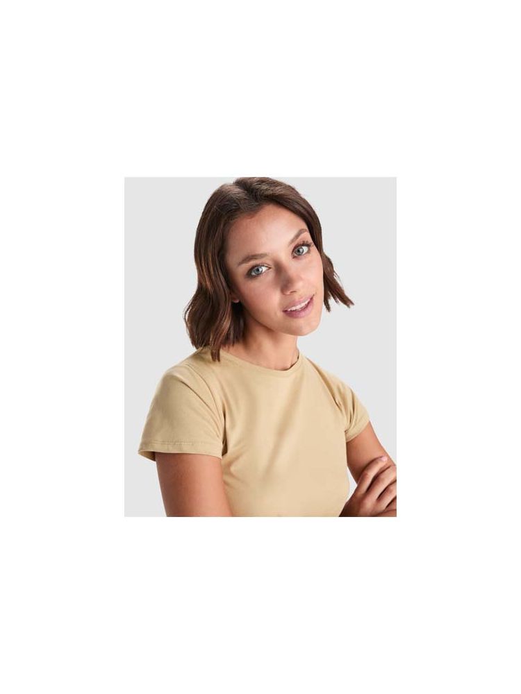Damska dopasowana koszulka z krótkim rękawem. Okrągły prążkowany dekolt 1×1. Wzmocnione, kryte szwy na kołnierzu. Usuwalna metka.