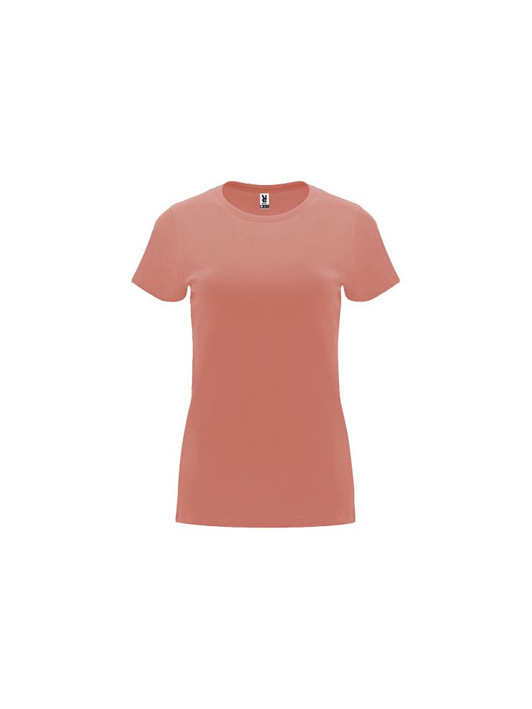 Damska dopasowana koszulka z krótkim rękawem. Okrągły prążkowany dekolt 1×1. Wzmocnione, kryte szwy na kołnierzu. Usuwalna metka.