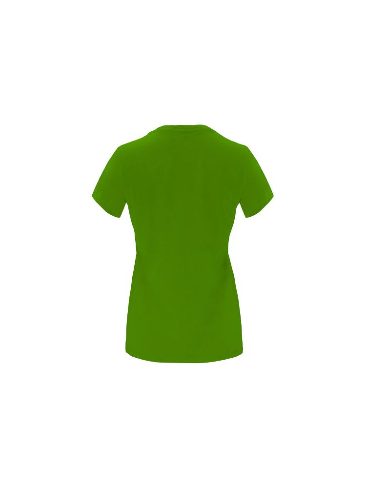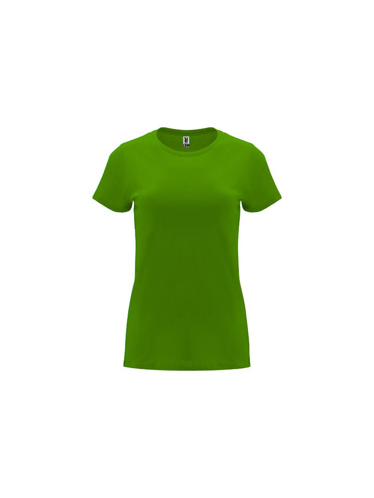 Damska dopasowana koszulka z krótkim rękawem. Okrągły prążkowany dekolt 1×1. Wzmocnione, kryte szwy na kołnierzu. Usuwalna metka.