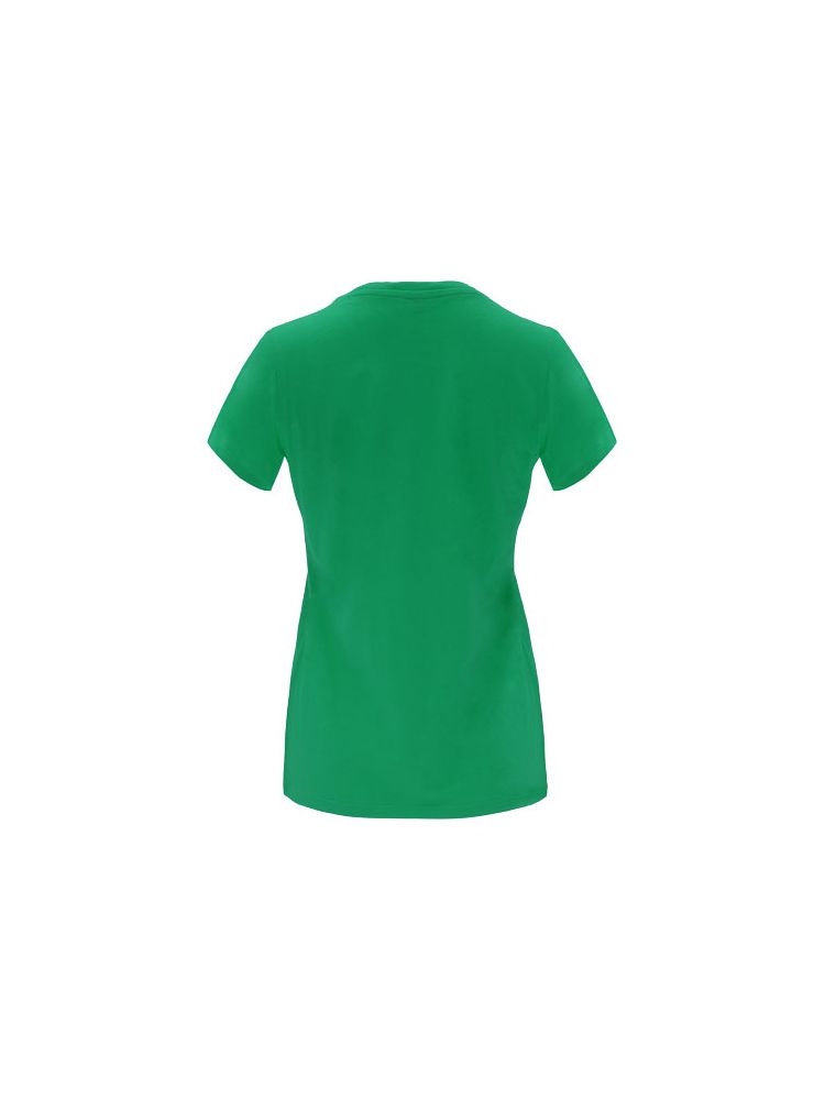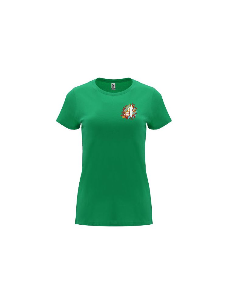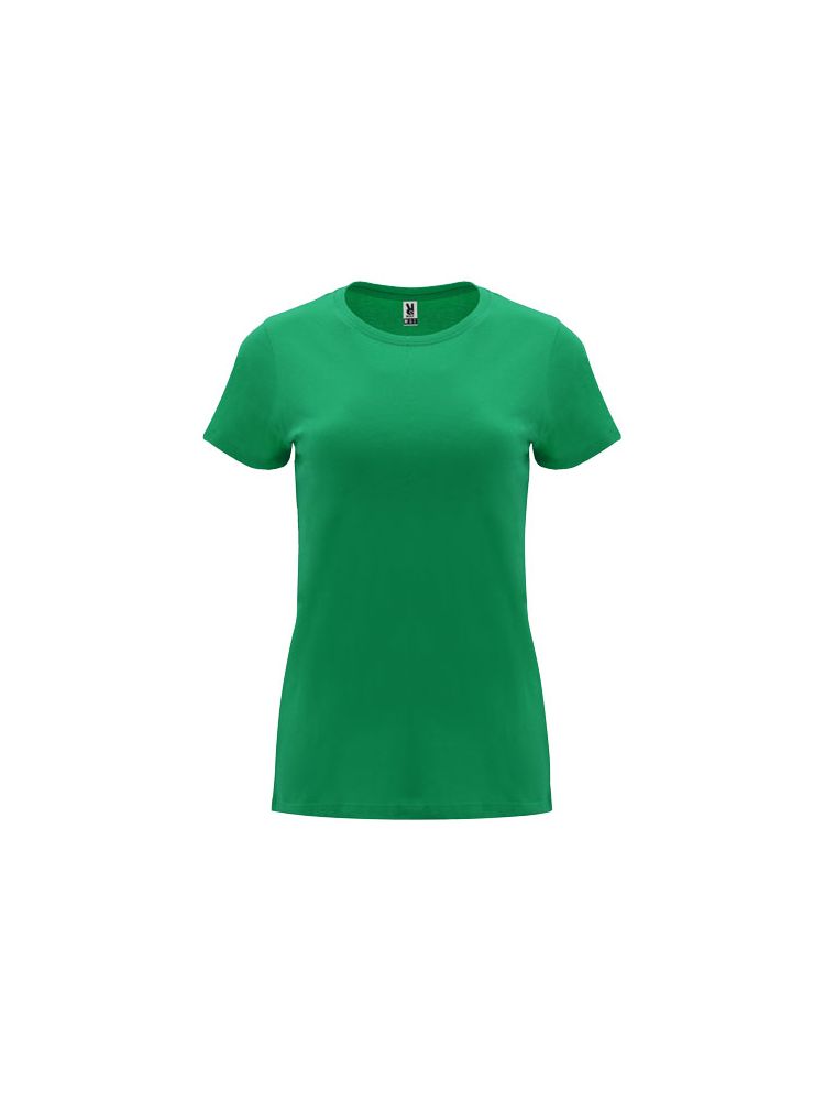Damska dopasowana koszulka z krótkim rękawem. Okrągły prążkowany dekolt 1×1. Wzmocnione, kryte szwy na kołnierzu. Usuwalna metka.