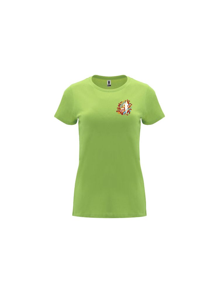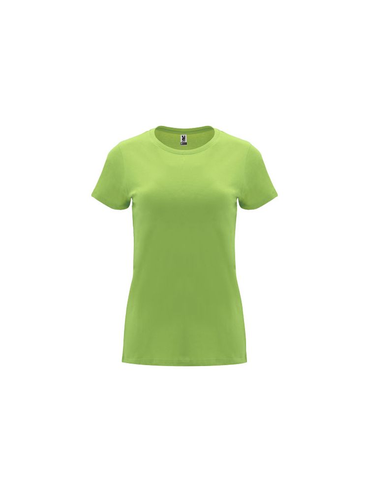 Damska dopasowana koszulka z krótkim rękawem. Okrągły prążkowany dekolt 1×1. Wzmocnione, kryte szwy na kołnierzu. Usuwalna metka.