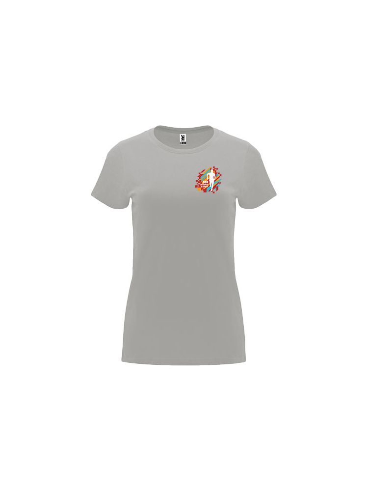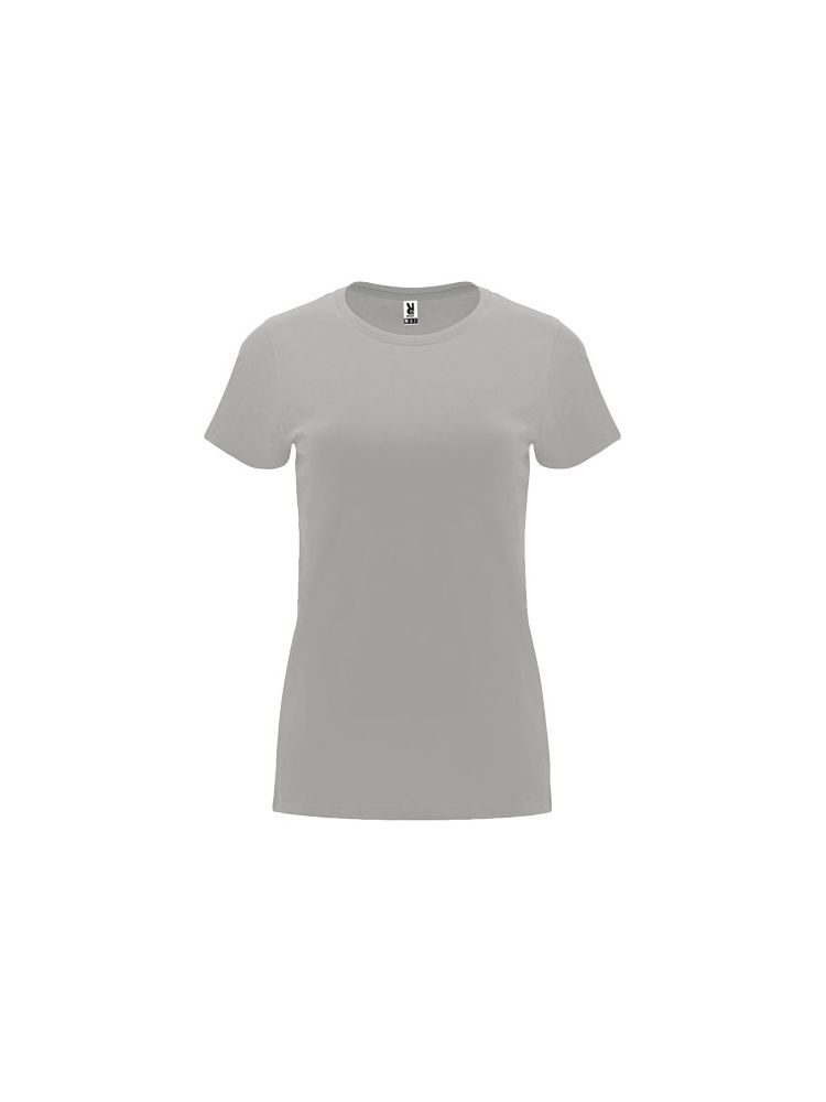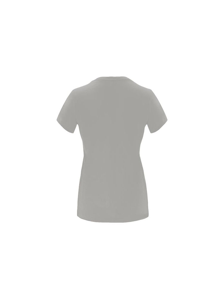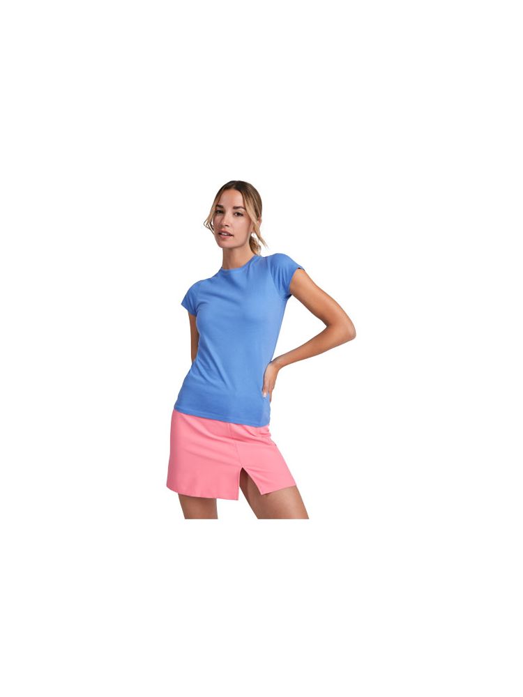 Damska dopasowana koszulka z krótkim rękawem. Okrągły prążkowany dekolt 1×1. Wzmocnione, kryte szwy na kołnierzu. Usuwalna metka.