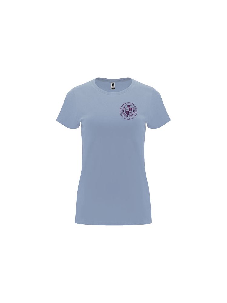 Damska dopasowana koszulka z krótkim rękawem. Okrągły prążkowany dekolt 1×1. Wzmocnione, kryte szwy na kołnierzu. Usuwalna metka.
