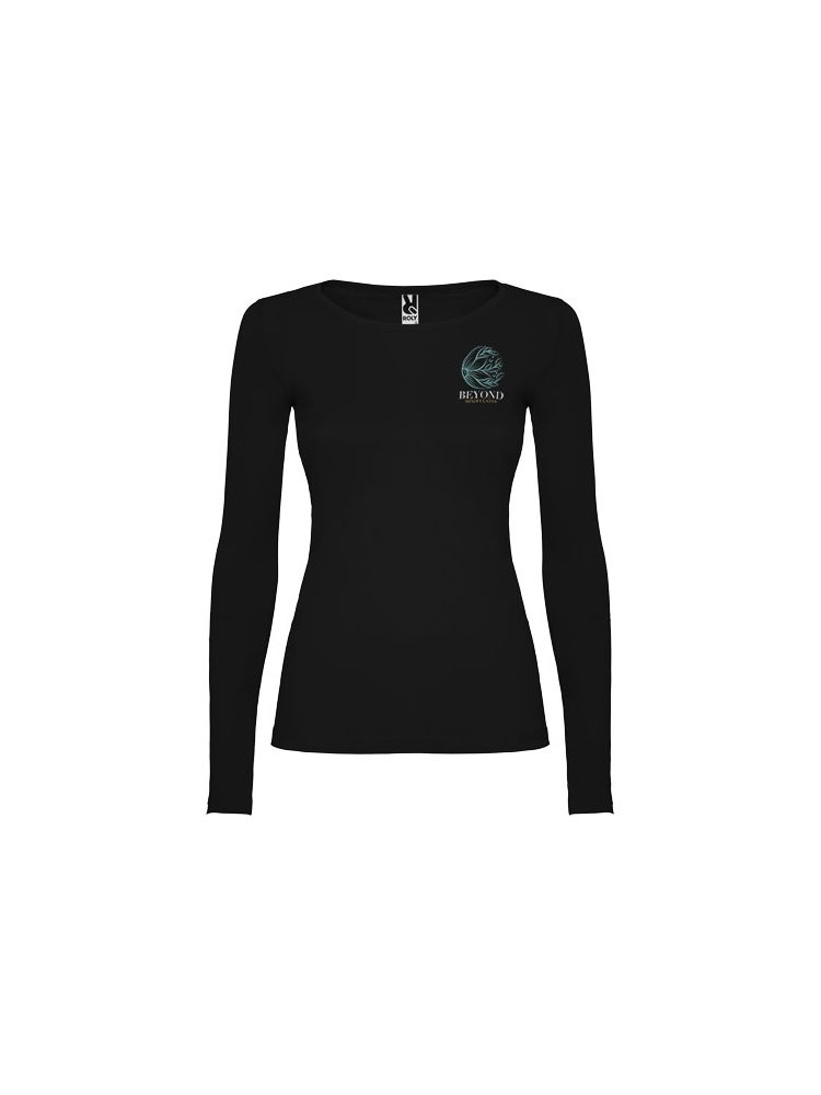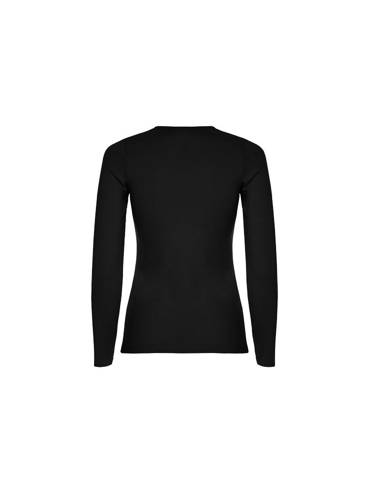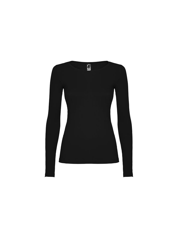 Częściowo dopasowana koszulka z długim rękawem i delikatnym wykończeniem przy szyi. Bez mankietów. Szwy boczne. Usuwalna metka.