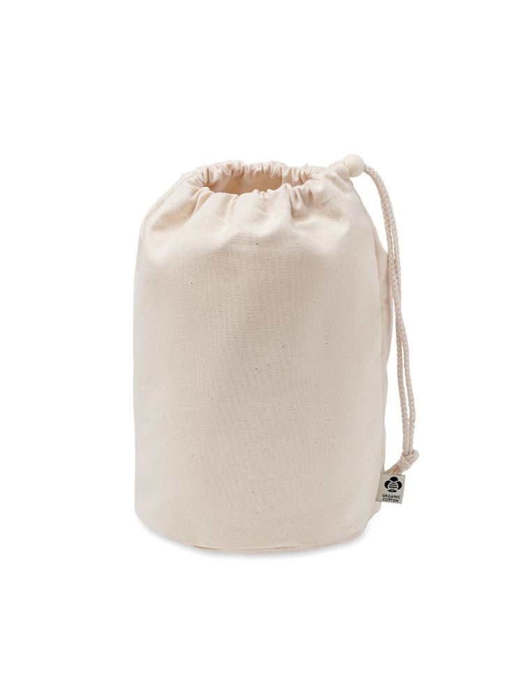 Torba na akcesoria z bawełny organicznej. 220 gr/m². Posiada wewnętrzne przegródki z siatki i drewnianą klamrę zamykającą.