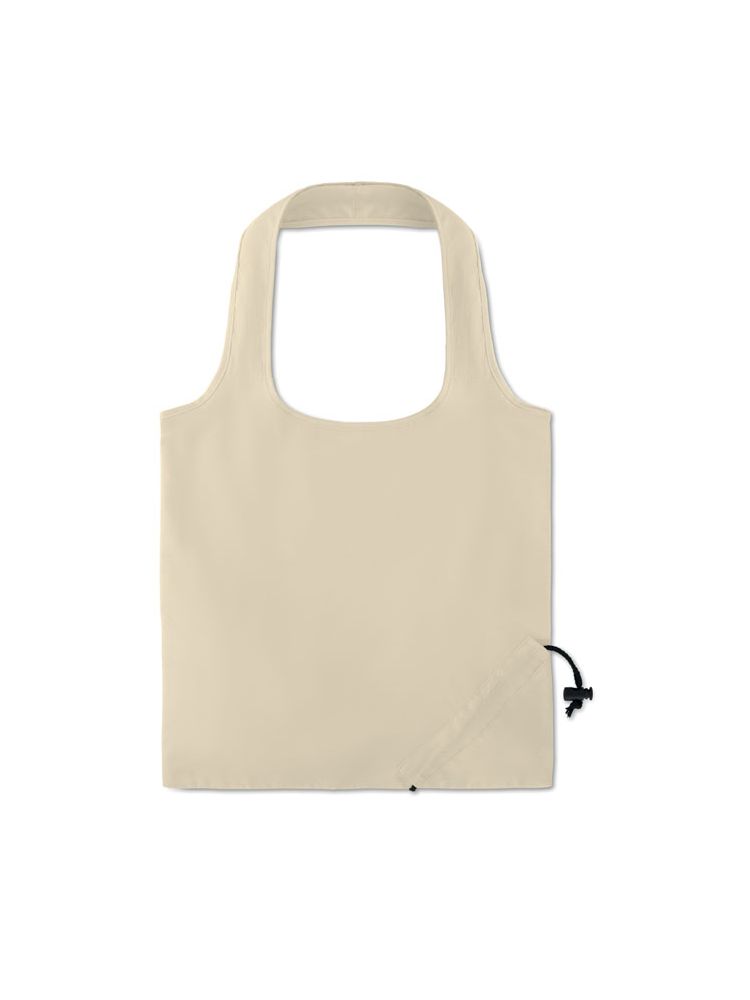 Składana torba na zakupy z bawełny o gramaturze 105 g/m2, z krótkimi uchwytami oraz z etui zamykanym na sznurek.