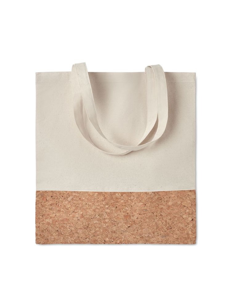 Bawełniana torba na zakupy ze wstawką z korka. Długie uchwyty. 160 g / m². Korek jest materiałem naturalnym, ze względu na jego strukturalną naturę i porowatość powierzchni ostateczny wygląd nadruku na każdym artykule może się różnić.