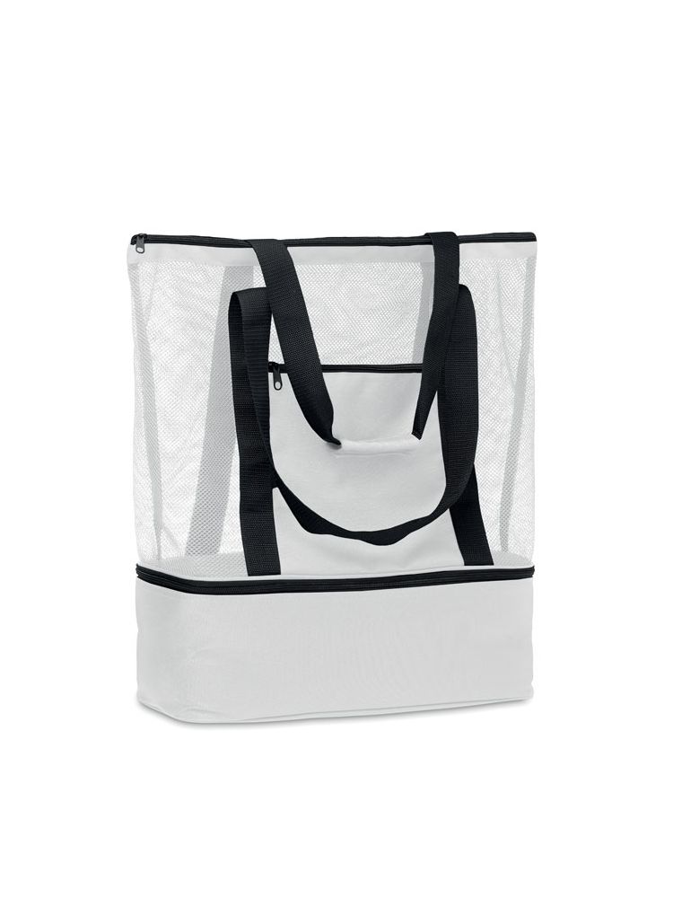 Torba na zakupy z siatki RPET z długimi uchwytami i kieszenią na zamek z przodu. W dolnej części torby znajduje się część termoizolacyjna, 600D RPET.
