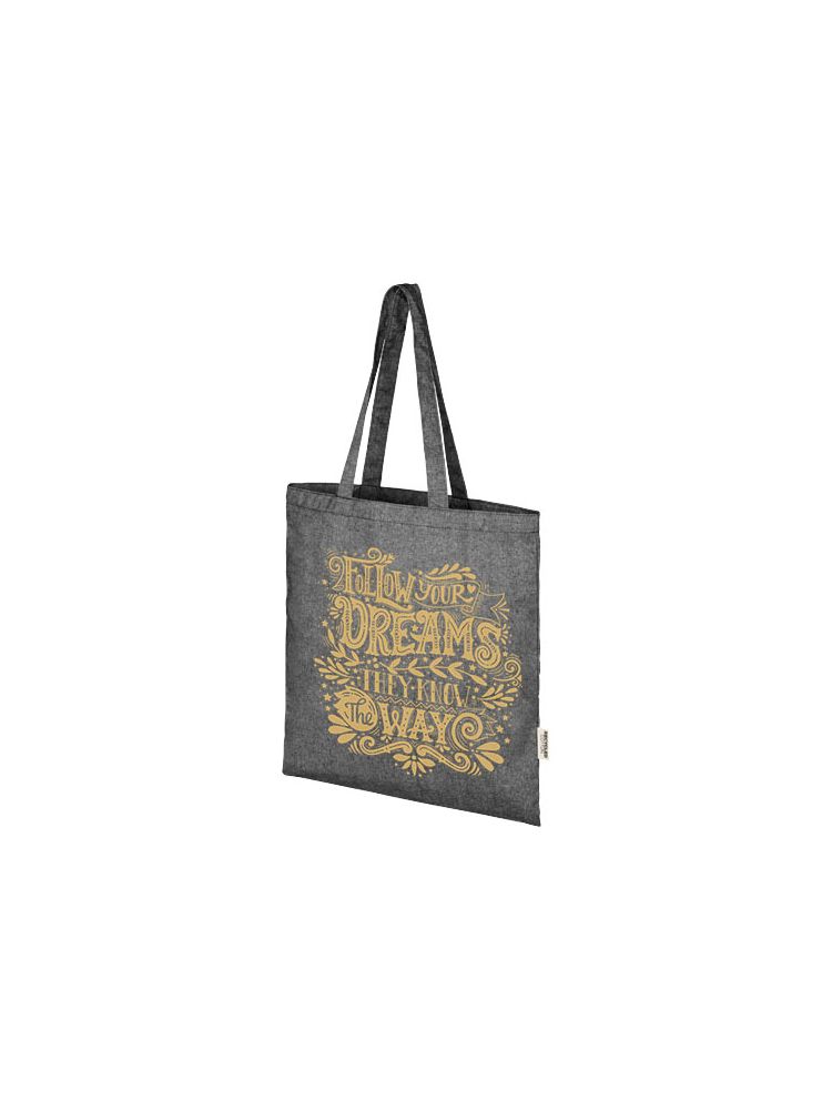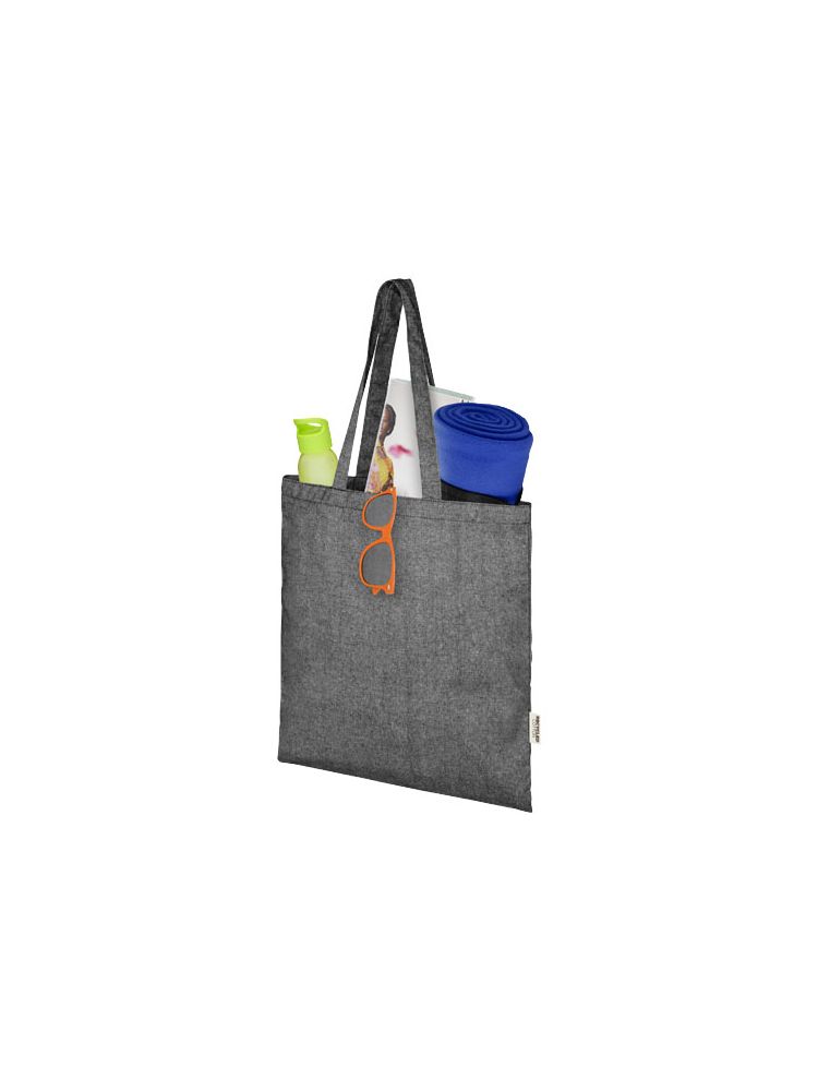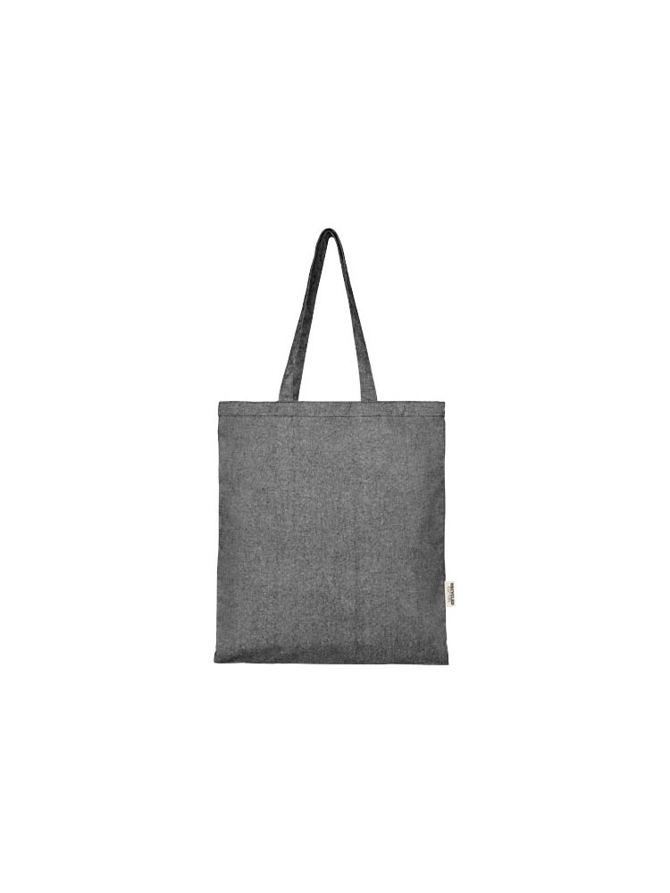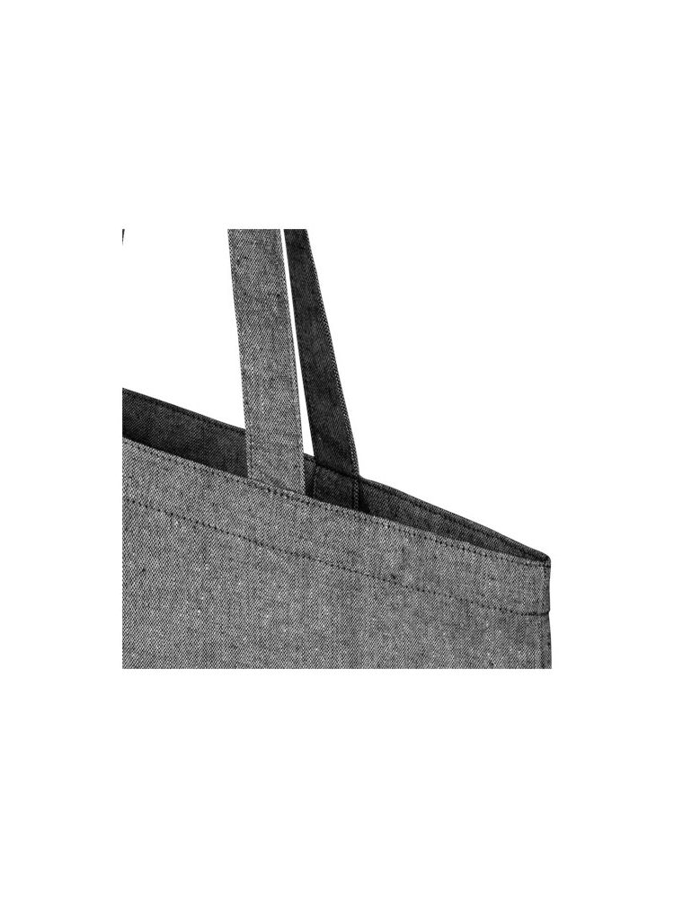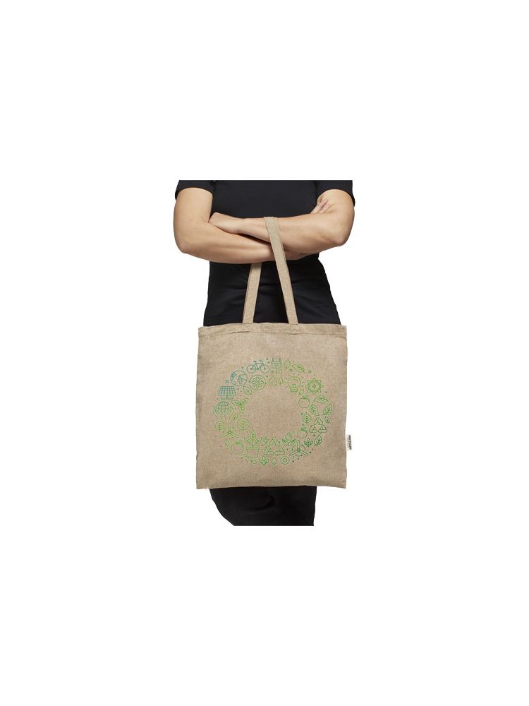 Torba na zakupy wykonana z mieszanki bawełny i poliestru pochodzących z recyklingu o gramaturze 150 g/m². Torbę można łatwo złożyć, aby zmieściła się w niewielkiej przestrzeni i jest idealnym towarzyszem podczas różnych czynności, takich jak zakupy spożywcze, jednodniowe wycieczki lub projekty rzemieślnicze. Bawełna poddana recyklingowi pochodzi z tzw. wstępnych odpadów konsumpcyjnych wytwarzanych przez zakłady włókiennicze w trakcie procesu cięcia. Podobne kolory są mieszane ze sobą, więc nie jest wymagane dodatkowe barwienie. Ze względu na charakter bawełny pochodzącej z recyklingu mogą występować niewielkie różnice w kolorze. Dodaje to bardziej autentycznego wyglądu. Do każdej torby dołączony jest również znacznik Aware™. Ta innowacyjna funkcja pozwala użytkownikom prześledzić za pomocą kodu QR pochodzenie produktu i pokonaną przez niego drogę, zwiększając przejrzystość łańcucha dostaw i wspierając silniejszy związek między produktem a jego procesem produkcyjnym. Wytrzymałość do 5 kg. Długość uchwytu: 31 cm.