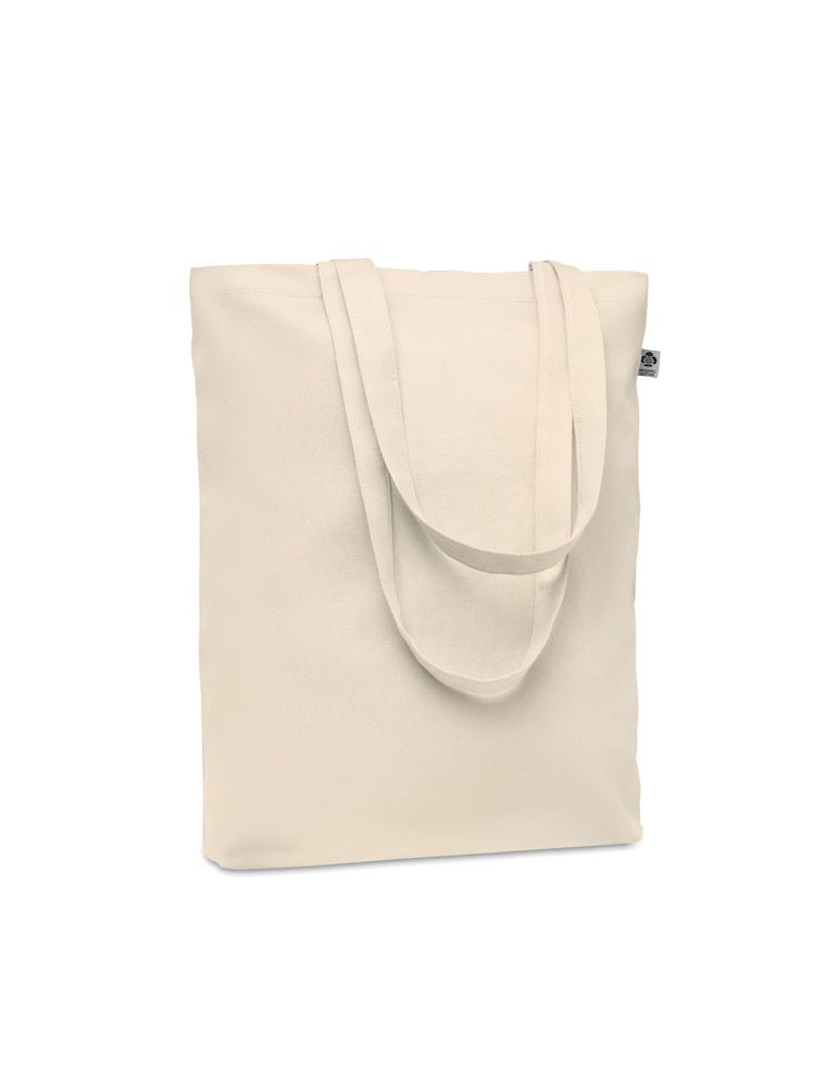 Organiczna torba na zakupy z płótna, z długimi uchwytami i klinem u dołu. 270 gr/m². Ten produkt posiada certyfikat OEKO-TEX® STANDARD 100.