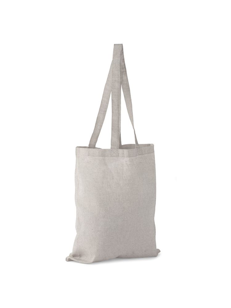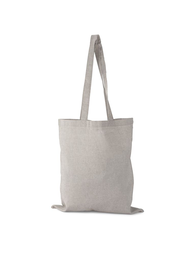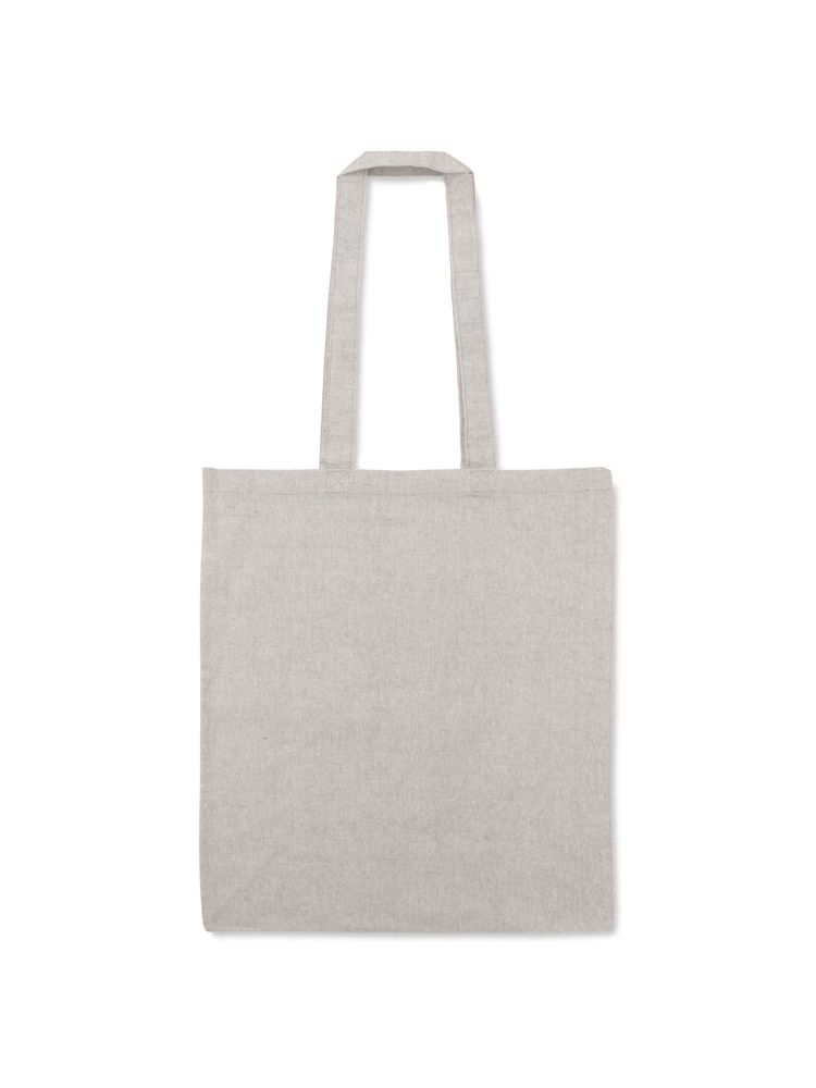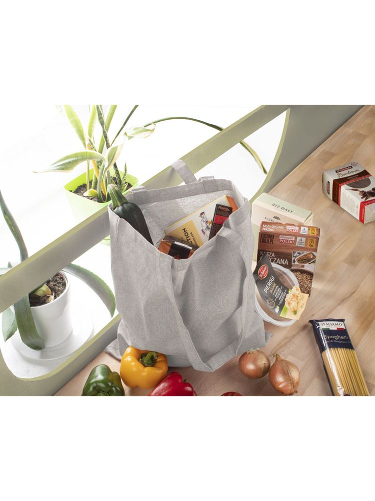 Torba MELANGE wykonana jest z bawełny pozyskanej z recyklingu, dzięki czemu oszczędność wody w procesie produkcyjnym jest znaczna. Posiada rączki o długości około 70 cm, poszerzone boki i dno. Gramatura bawełny 140g/m2.