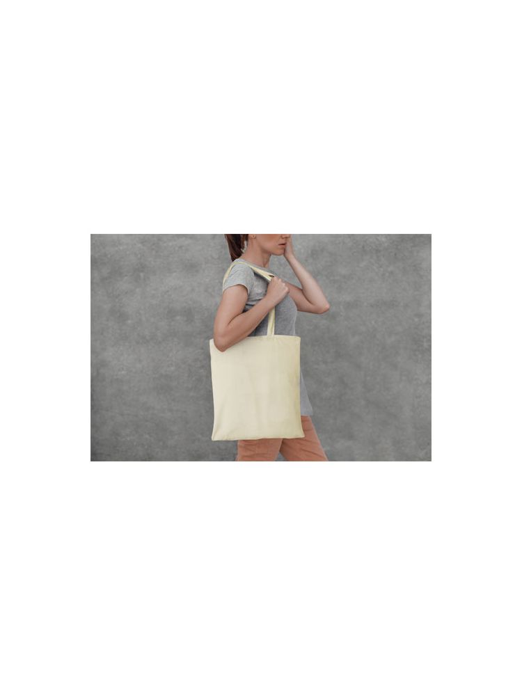 Mocna i trwała torba z bawełny 180 g/m² z dużą komorą główną i widocznym logo. Wytrzymały materiał bawełniany sprawia, że nadaje się do noszenia cięższych przedmiotów. Uchwyty mają długość 30 cm i są wystarczająco długie, aby nosić torbę na jednym ramieniu.