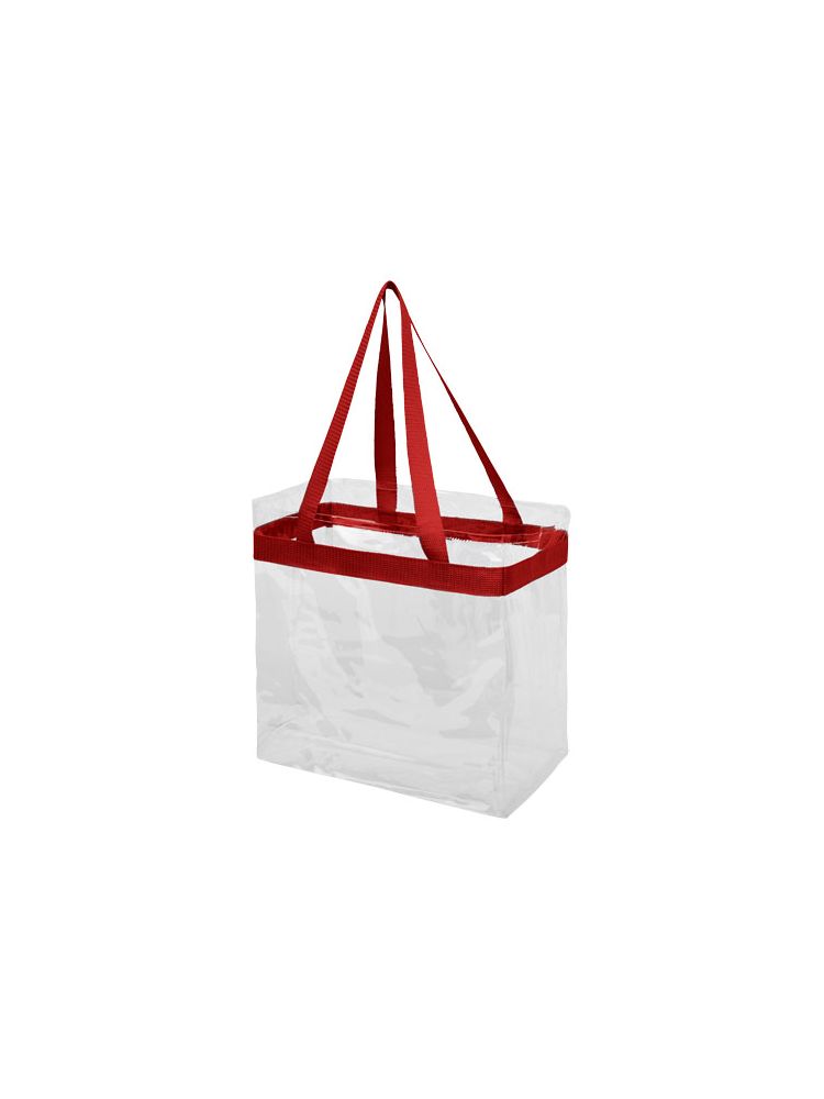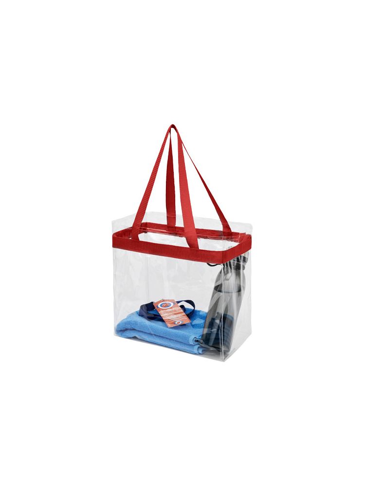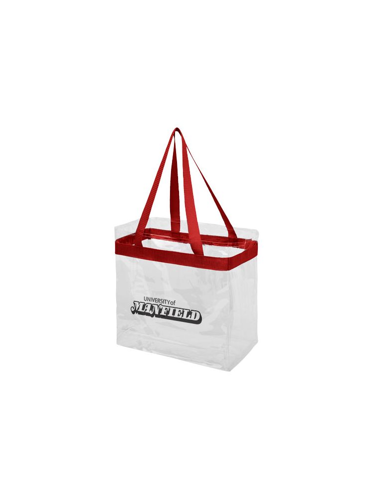 Transparentna torba idealna dla fanów sportu, gdy chcą spakować się na stadion. Świetna także w szkole i pracy, która wymaga przechodzenia przez kontrolę bezpieczeństwa. Jedna kieszeń ze sportowym wykończeniem i podwójnymi uchwytami. Długość uchwytów 27 cm. Nie zawiera akcesoriów.