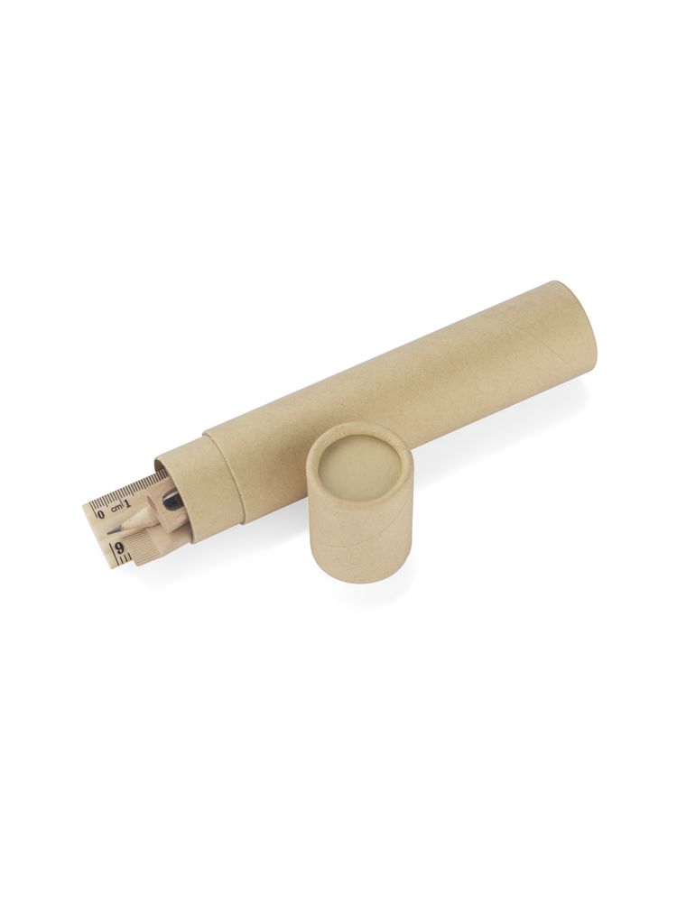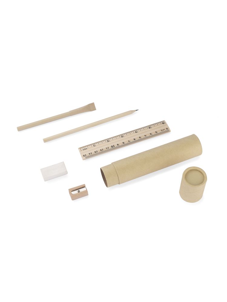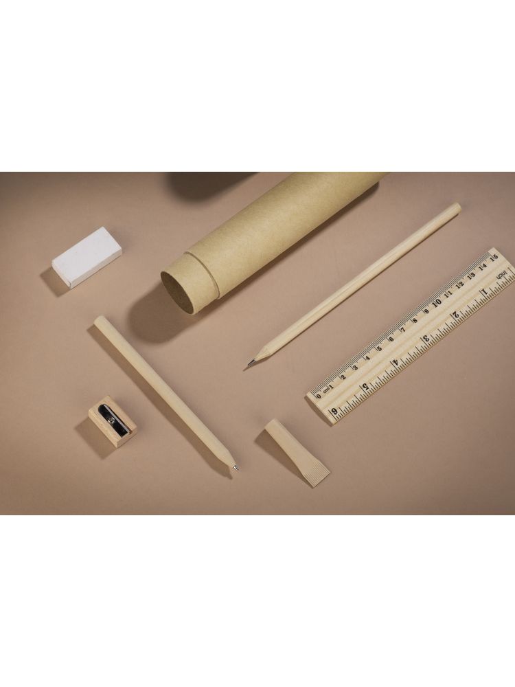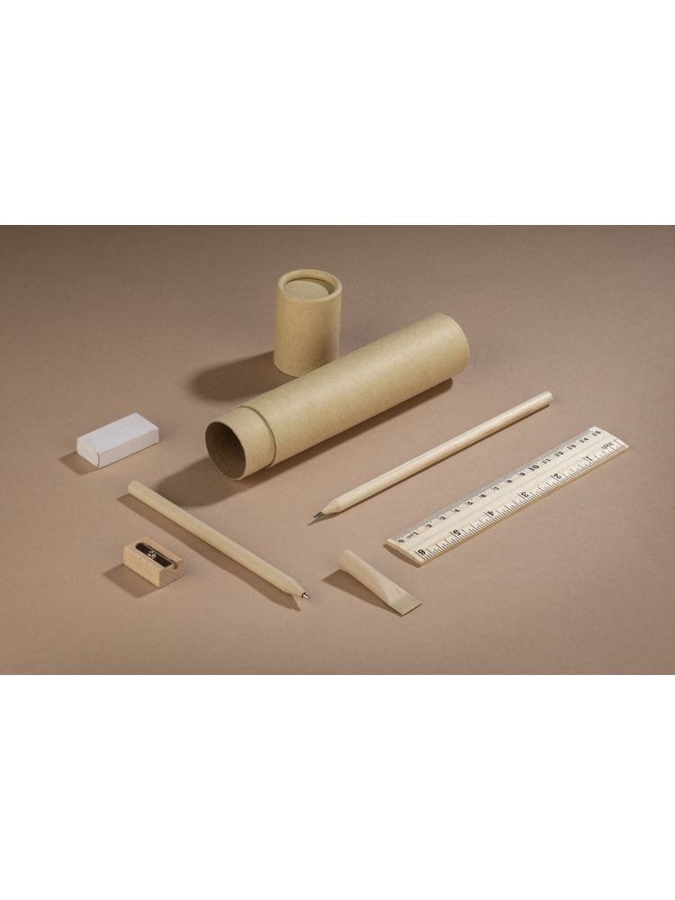 Piórnik ekologiczny wykonany z kraftowego papieru w kształcie tuby. W zestawie: papierowy długopis, drewniany: ołówek, temperówka, linijka oraz gumka do mazania.
