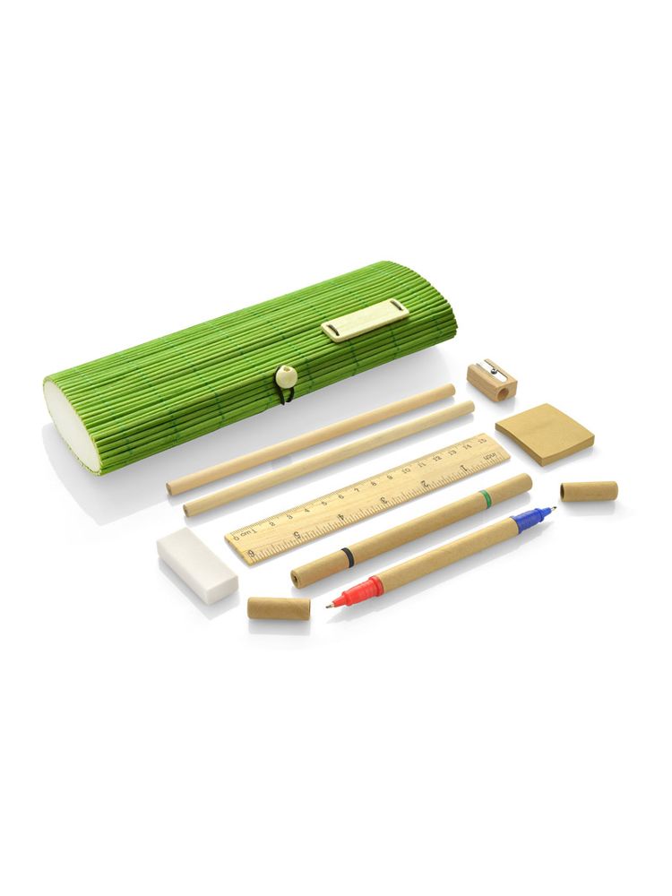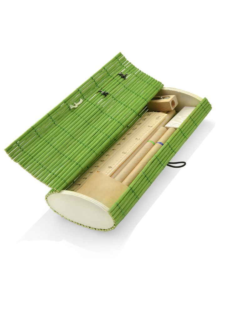 Bambusowy piórnik z ekologicznymi przyborami zawiera: dwa dwustronne długopisy (czerwony, niebieski, zielony i czarny), dwa ołówki, linijkę, temperówkę, gumkę do mazania oraz karteczki samoprzylepne. Ekologia, piękny wygląd i możliwość praktycznego zastosowania w jednym produkcie.