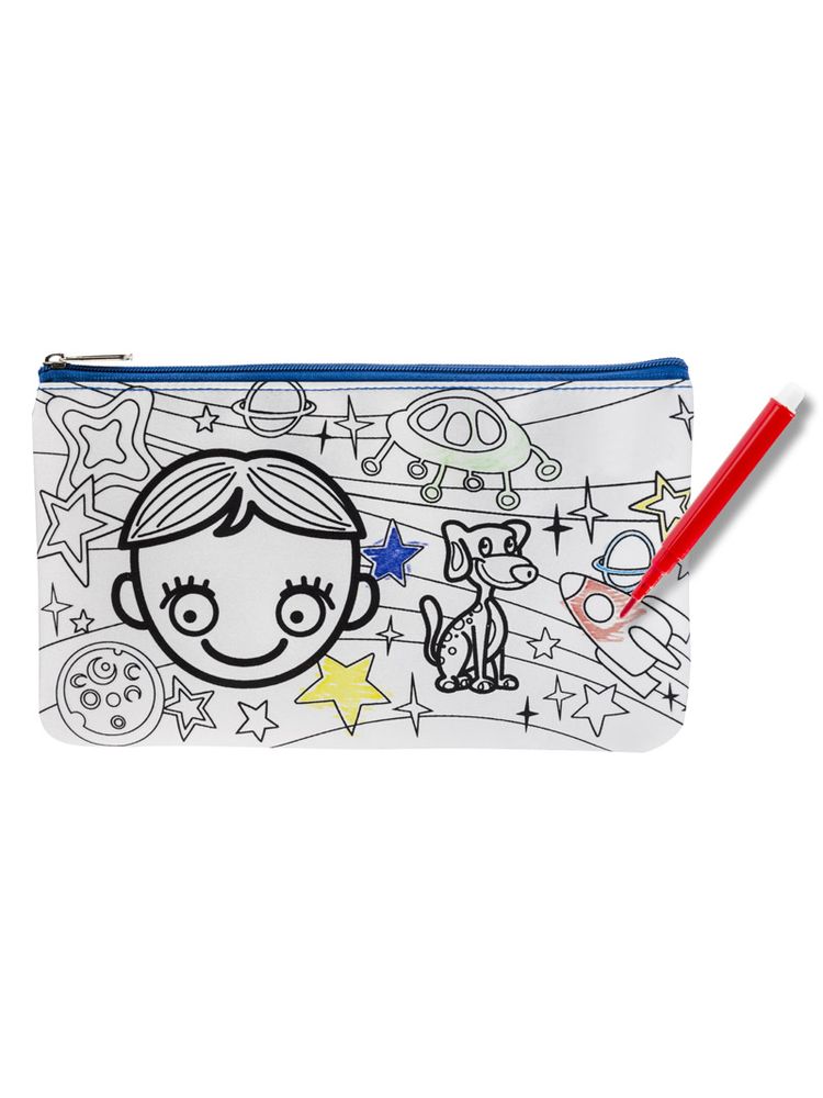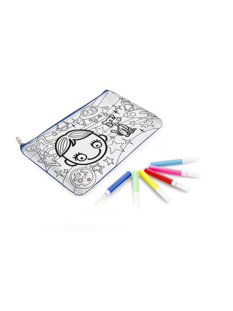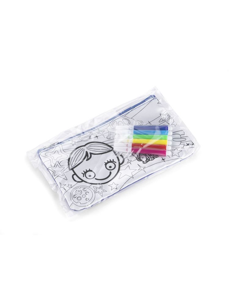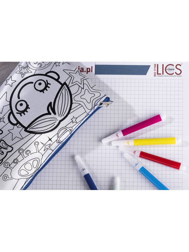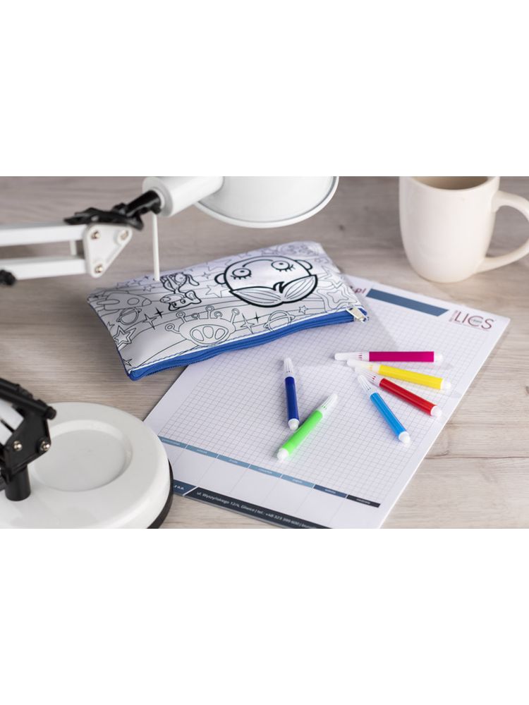 Piórnik ozdobiony grafiką do samodzielnego pokolorowania. Upominek, któyy potrafi zaangażować i bawić. W zestawie dołączone pisaki w 6 kolorach. Piórnik jednokomorowy zapinany na zamek.