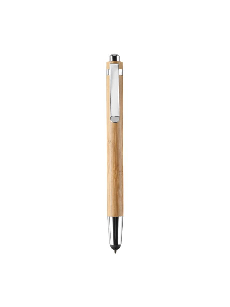 Automatyczny bambusowy długopis z niebieskim wkładem i końcówką do ekranów dotykowych. Chromowane, błyszczące wykończenie. Bambus jest produktem naturalnym, dlatego mogą wystąpić nieznaczne różnice w kolorze, wzorze i rozmiarze.