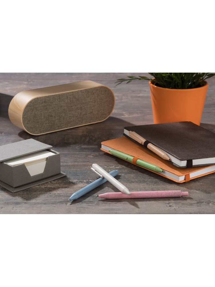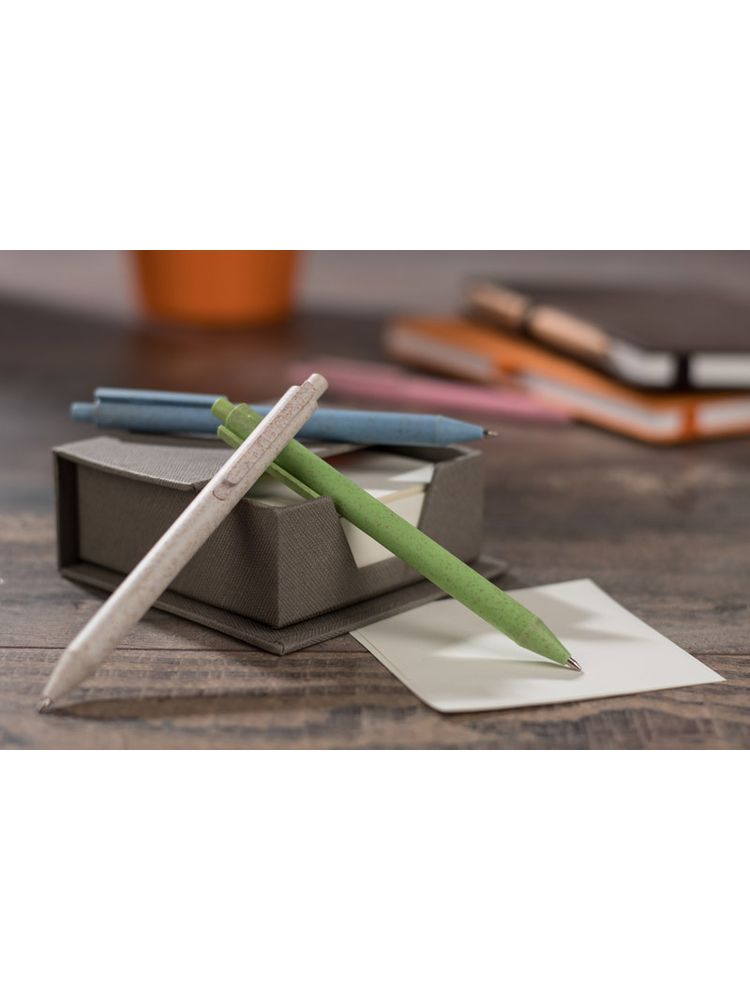 Długopis REVI został wykonany z myślą o wszystkich, którym bliska jest idea redukowania odpadów z tworzywa sztucznego. Tradycyjne tworzywo sztuczne zostało zastąpione specjalnym materiałem wykonanym w 40% z naturalnej słomy. Klasyczny, prosty kształt czyni go uniwersalnym gadżetem. Długopis automatyczny. Wkład typu X20 w kolorze niebieskim.
