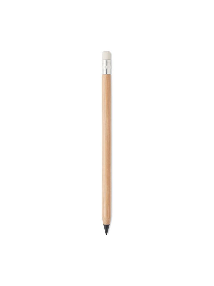 Wieczny długopis bez tuszu z bambusowym korpusem i gumką, z papierową zatyczką. Długopis pisze za pomocą grafitowej końcówki. Świetna, zrównoważoną alternatywą dla tradycyjnego długopisu. Bambus jest produktem naturalnym, mogą występować niewielkie różnice w kolorze i rozmiarze poszczególnych egzemplarzy, co może mieć wpływ na ostateczny efekt znakowania.