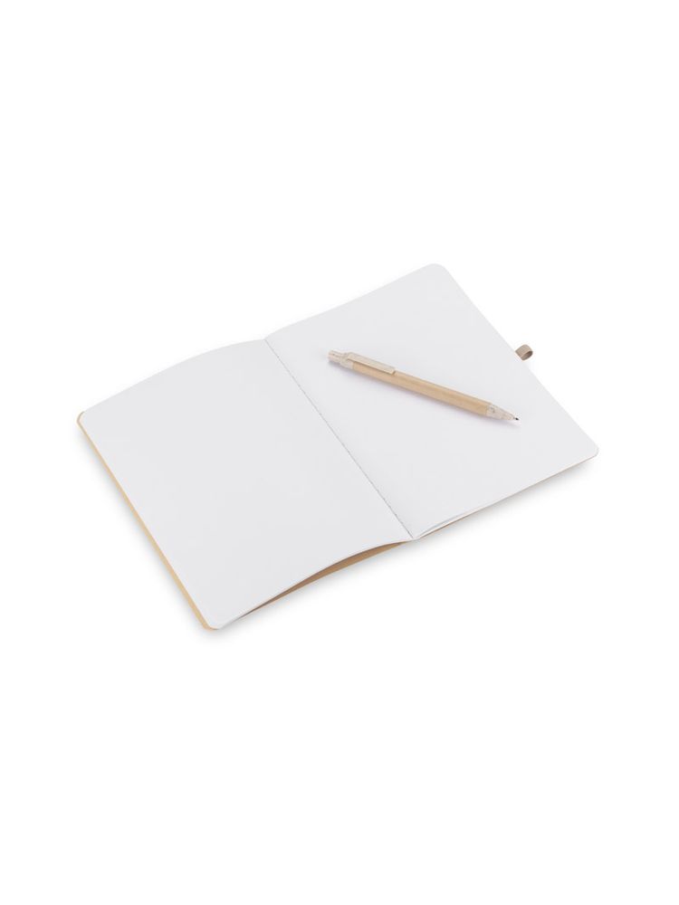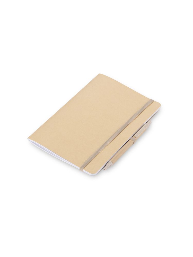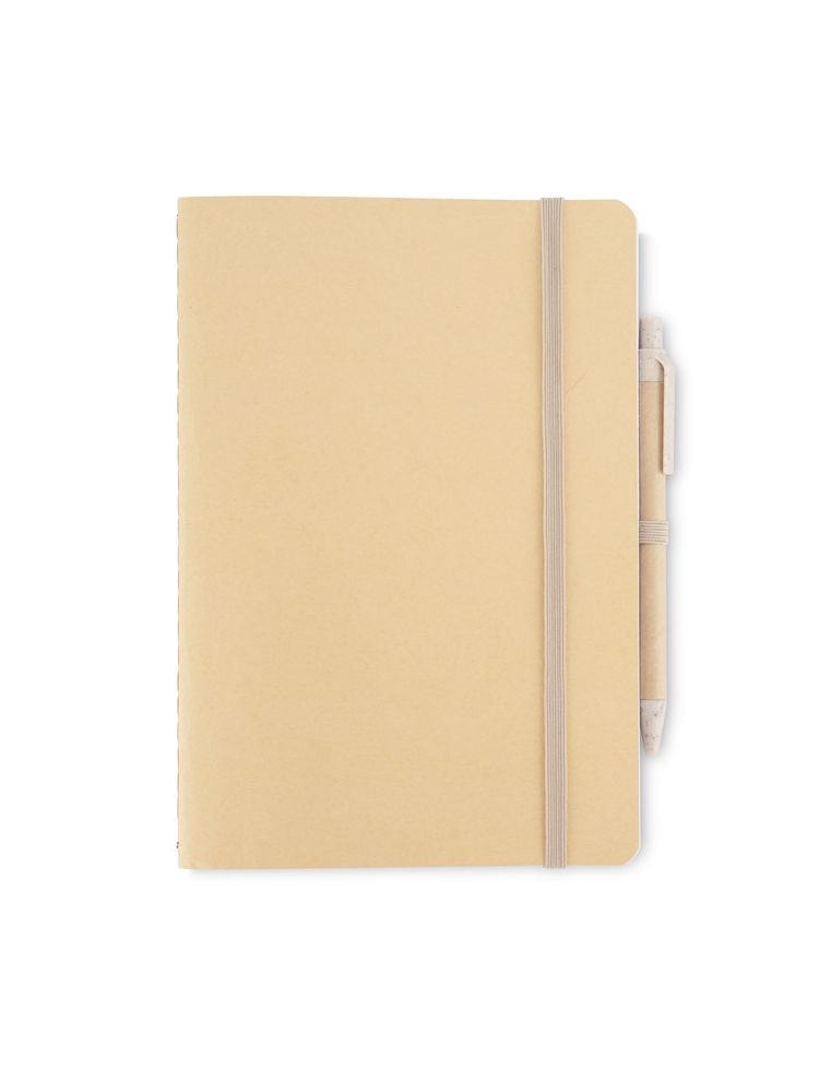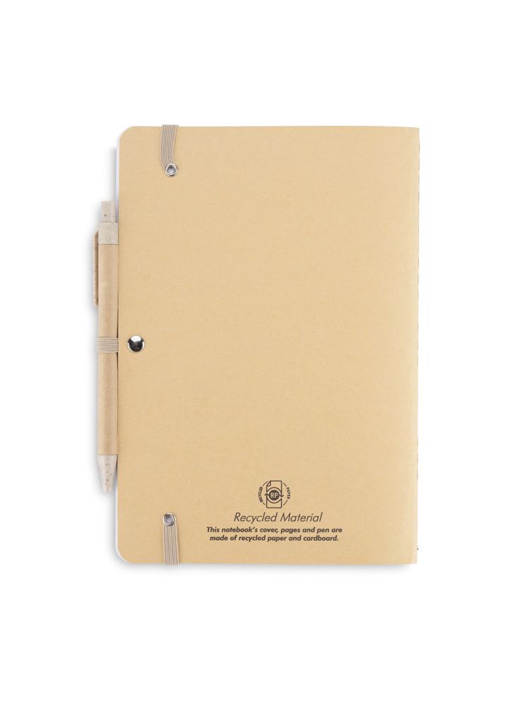 Notes REMATT w ekologicznej okładce wykonanej z recyklingowanego papieru w klasycznym brązowym kolorze. Do notesu dołączony jest długopis z niebieskim wkładem, którego korpus wykonany jest z recyklingowanego papieru, z wykończeniami z tworzywa ze słomy pszennej. Notes zamykany za pomocą gumki. Format A5.