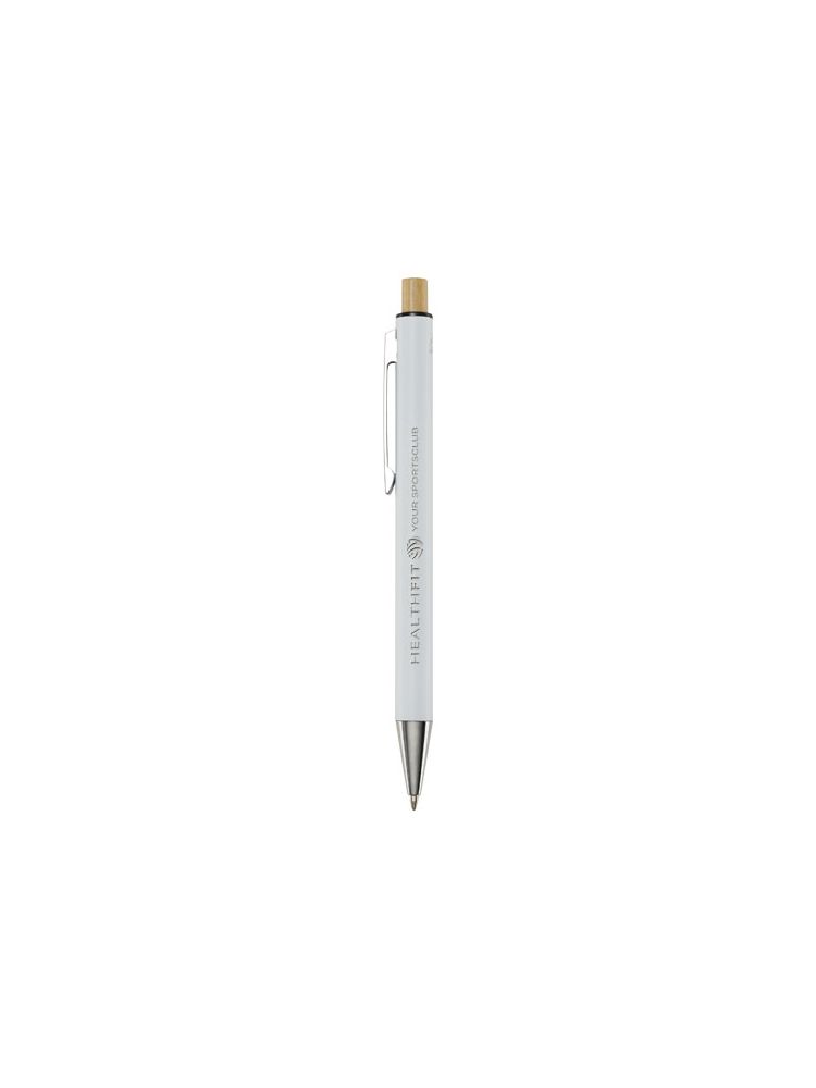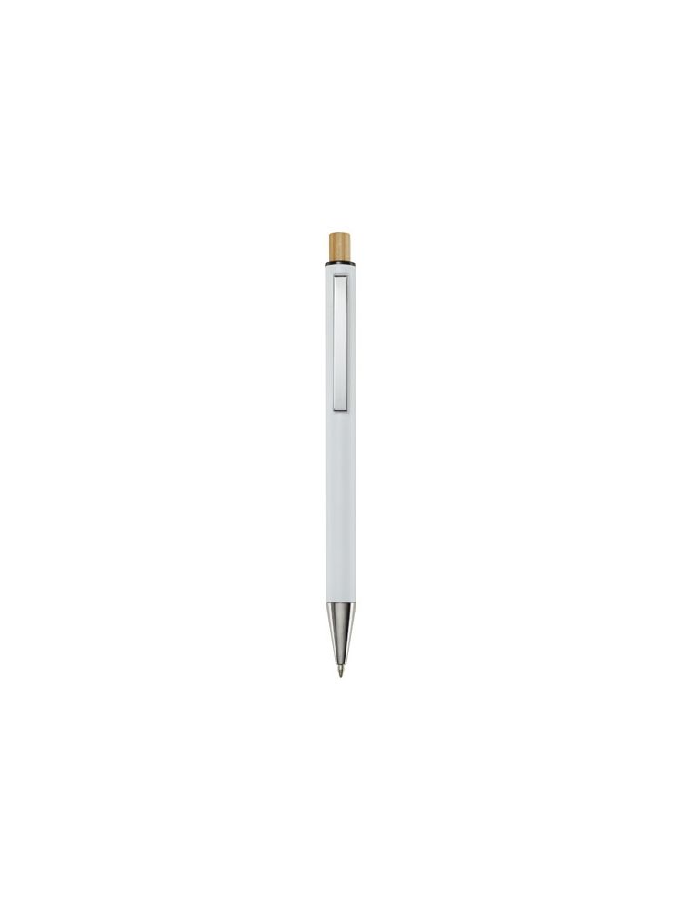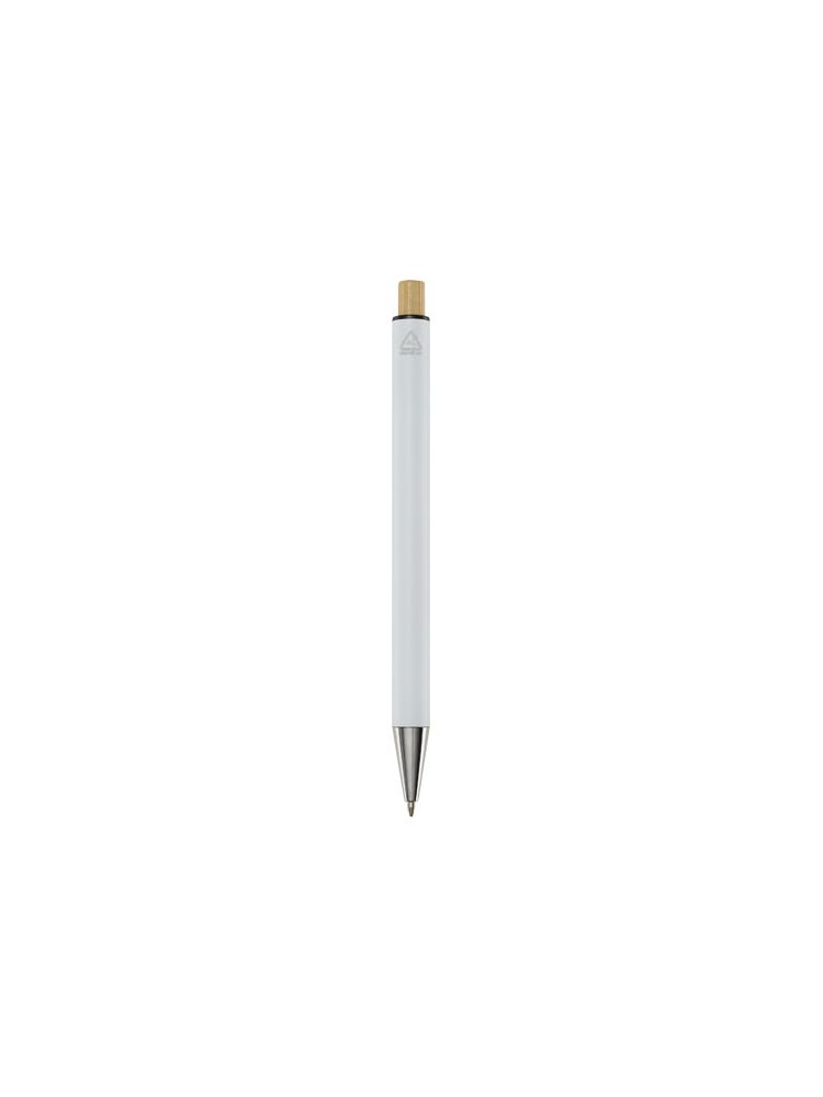 Cyrus długopis wykonany z aluminium pochodzącego z recyklingu, którego produkcja wymaga mniej energii niż w przypadku aluminium wyprodukowanego z surowców. Ogranicza również ilość odpadów na wysypiskach śmieci i pomaga chronić zasoby naturalne w celu zmniejszenia emisji gazów cieplarnianych. Przycisk jest wykonany z bambusa. Kolor tuszu: Czarny. Żywotność: 800 metrów. Rozmiar stalówki: 1,00 mm.