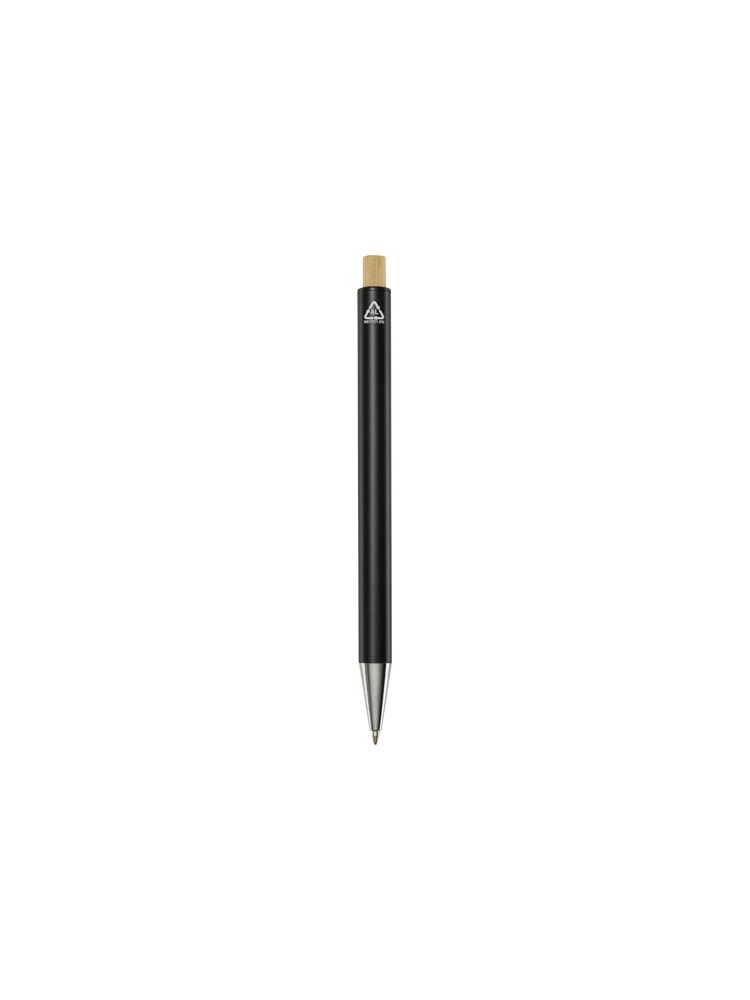 Cyrus długopis wykonany z aluminium pochodzącego z recyklingu, którego produkcja wymaga mniej energii niż w przypadku aluminium wyprodukowanego z surowców. Ogranicza również ilość odpadów na wysypiskach śmieci i pomaga chronić zasoby naturalne w celu zmniejszenia emisji gazów cieplarnianych. Przycisk jest wykonany z bambusa. Kolor tuszu: Czarny. Żywotność: 800 metrów. Rozmiar stalówki: 1,00 mm.