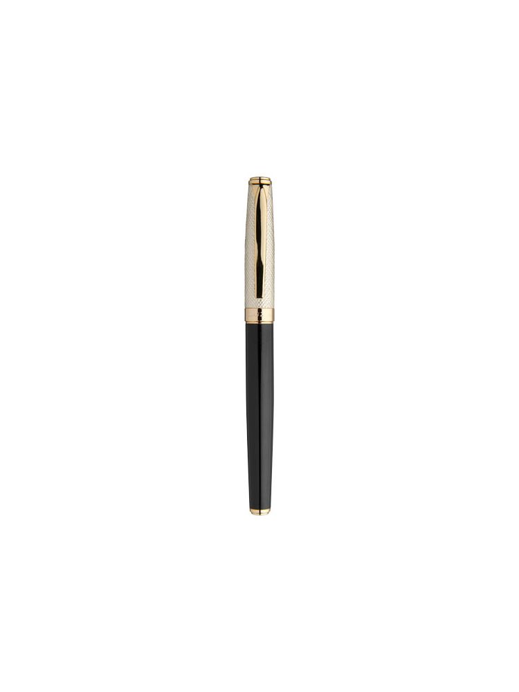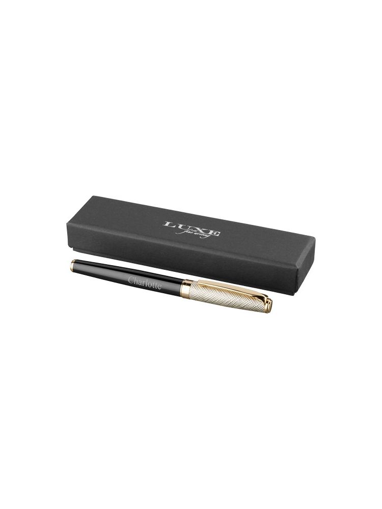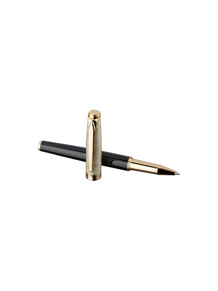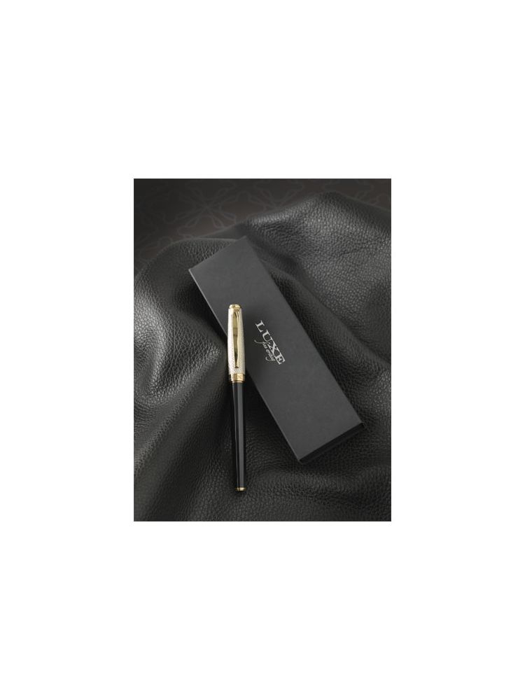 Luksusowe pióro kulkowe, ze złotą skórzaną zatyczką i lakierowanymi złotymi elementami, zapakowane w pudełko upominkowe Luxe. Dolny korpus wykonany jest z lakierowanego mosiądzu, a górny z mosiądzu i PU. Pióro kulkowe: 14 cm x 1,15 cm, waga: 32 gr, żywotność: 500 m.