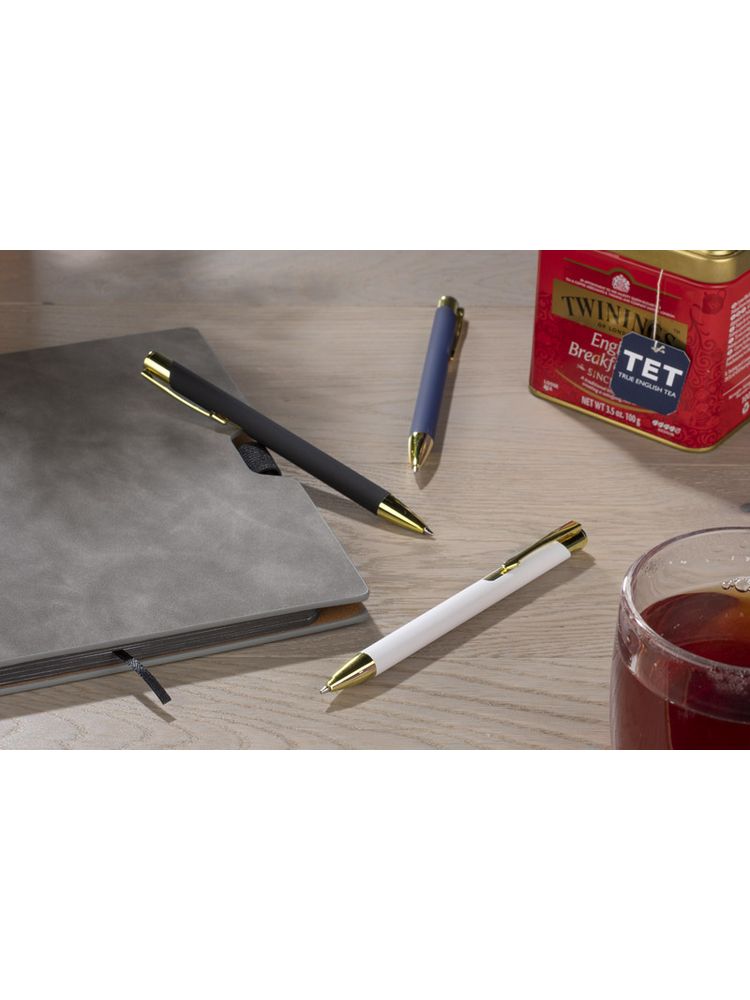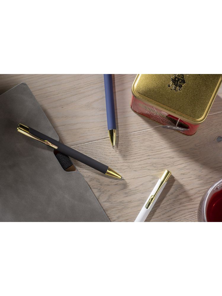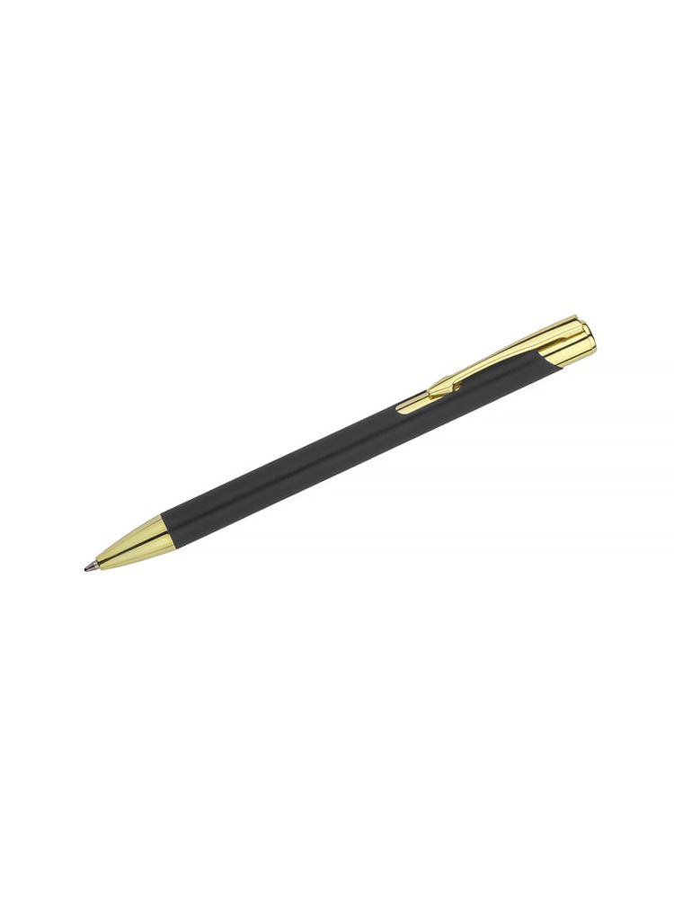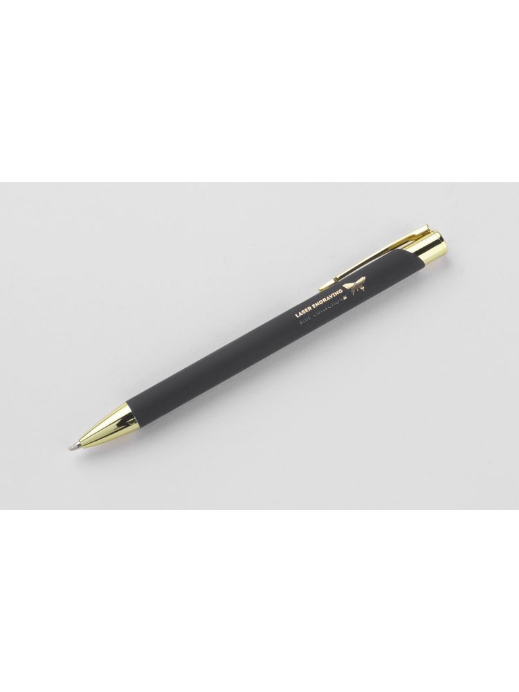 GOLDEN to długopis wyróżniający się przyjemną w dotyku gumowaną powierzchnią oraz wyjątkowo eleganckimi złotymi wykończeniami. Korpus wykonany z aluminium. Możliwość wygrawerowania logo w kolorze złotym, które doskonale pasuje do wykończeń długopisu. Długopis automatyczny. Wkład typu G2 w kolorze niebieskim.