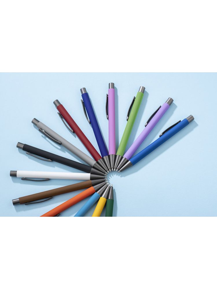 Długopis GOMA to prosty design połączony z przyjemną w dotyku gumowaną powierzchnią. Całość jest utrzymana w lekkich, matowych barwach. Wykonany z aluminium. Wykończenia w kolorze grafitowym. Wkład w kolorze czarnym.