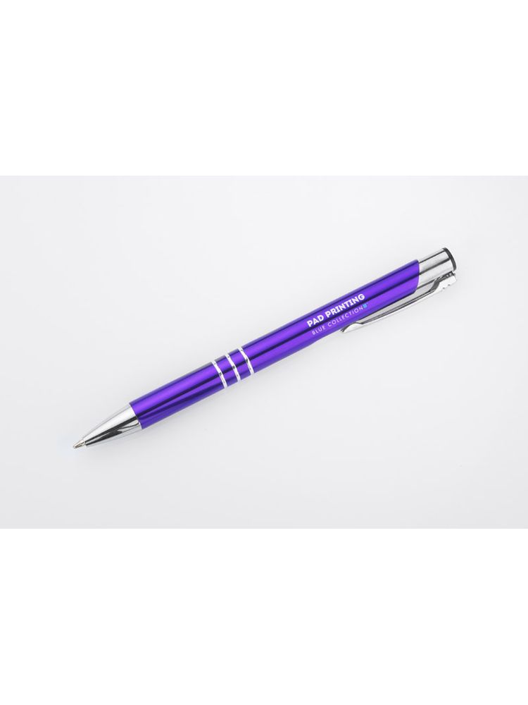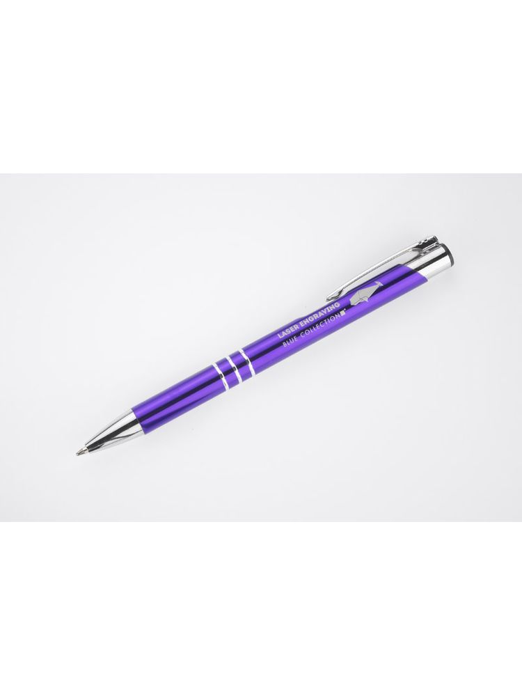 Metalowy długopis o metalizowanej chromowanej powierzchni. Długopis automatyczny z 3 ringami i niebieskim wkładem. Logo grawerujemy na powierzchni długopisu.