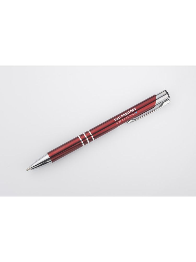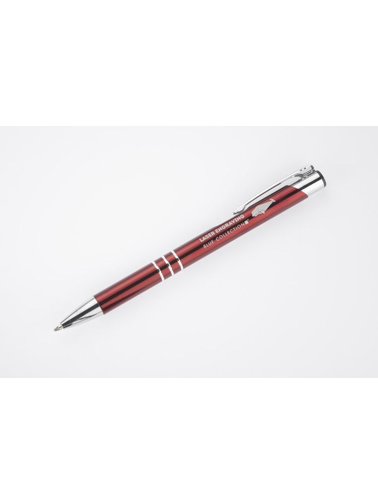 Metalowy długopis KALIPSO o metalizowanej chromowanej powierzchni. Długopis automatyczny z 3 ringami i niebieskim wkładem. Logo grawerujemy na powierzchni długopisu.