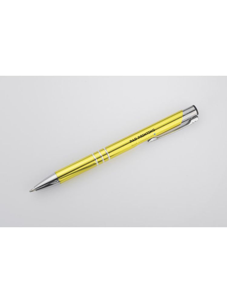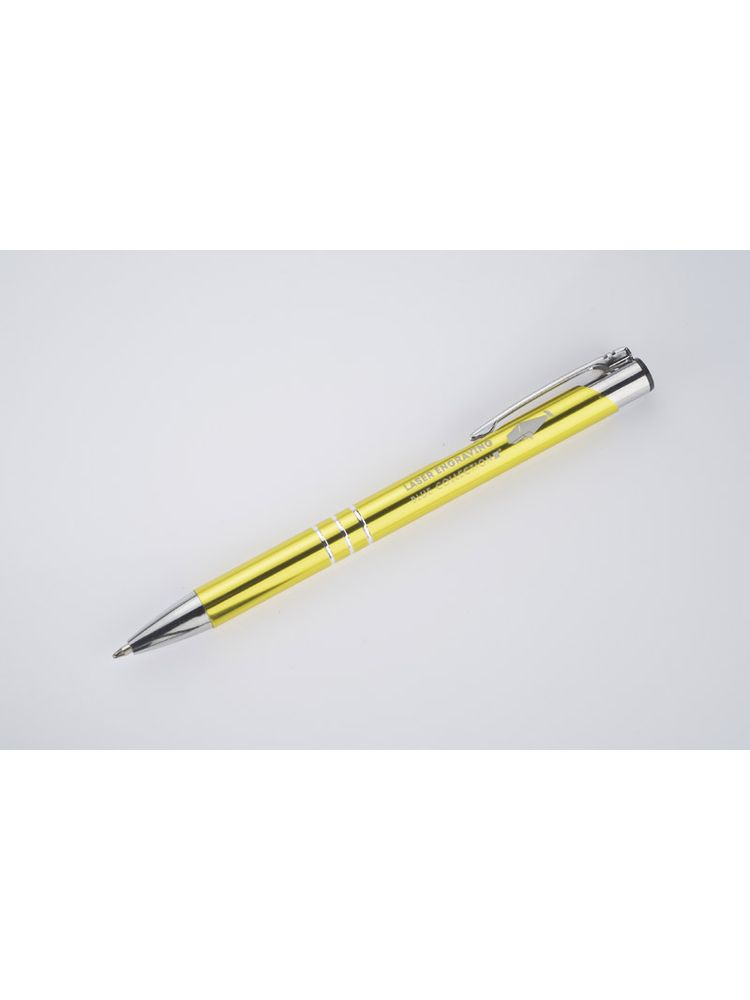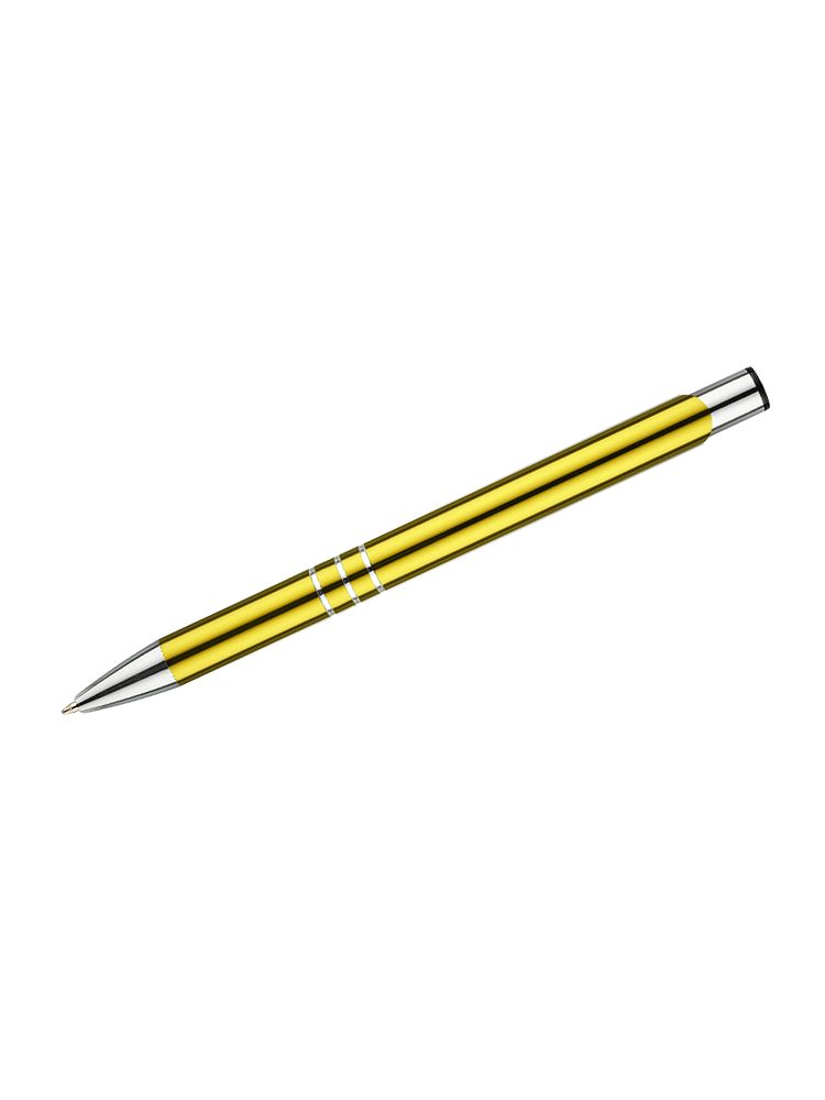 Metalowy długopis KALIPSO o metalizowanej chromowanej powierzchni. Długopis automatyczny z 3 ringami i niebieskim wkładem. Logo grawerujemy na powierzchni długopisu.