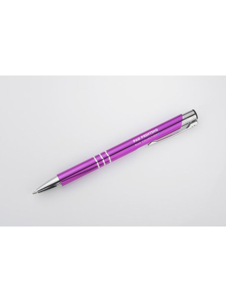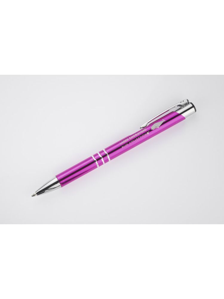 Metalowy długopis KALIPSO o metalizowanej chromowanej powierzchni. Długopis automatyczny z 3 ringami i niebieskim wkładem. Logo grawerujemy na powierzchni długopisu.