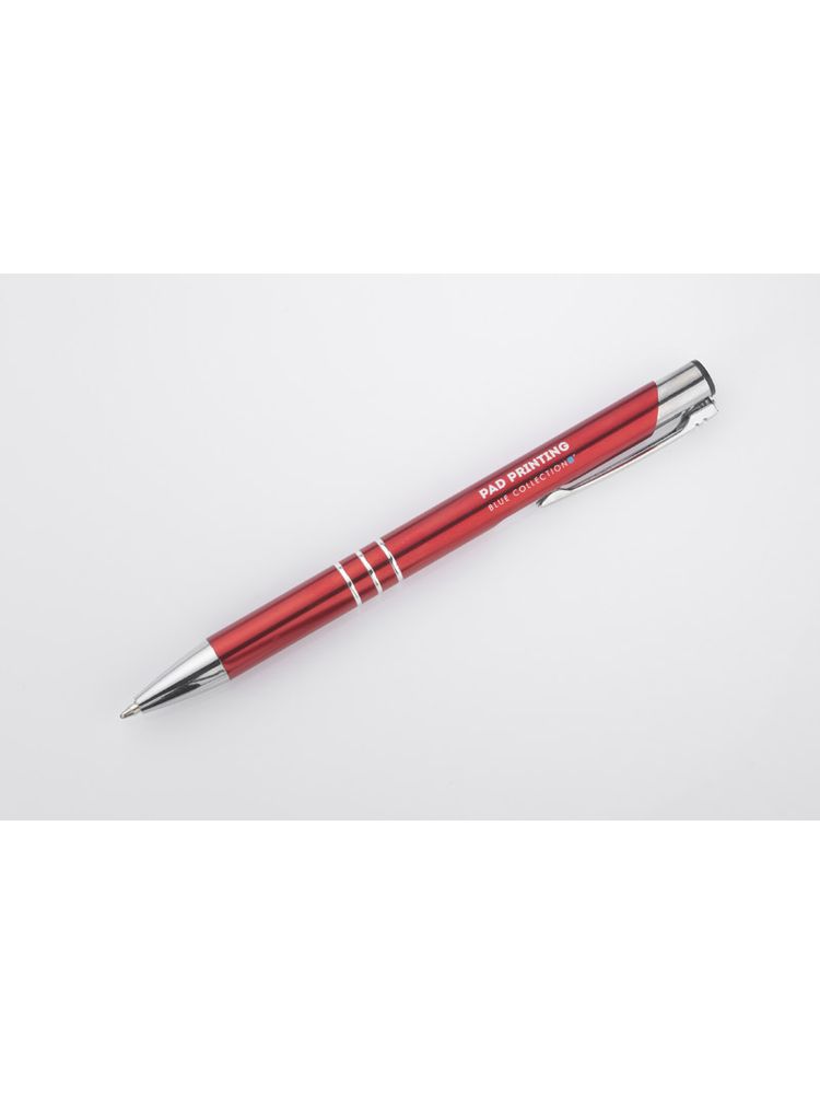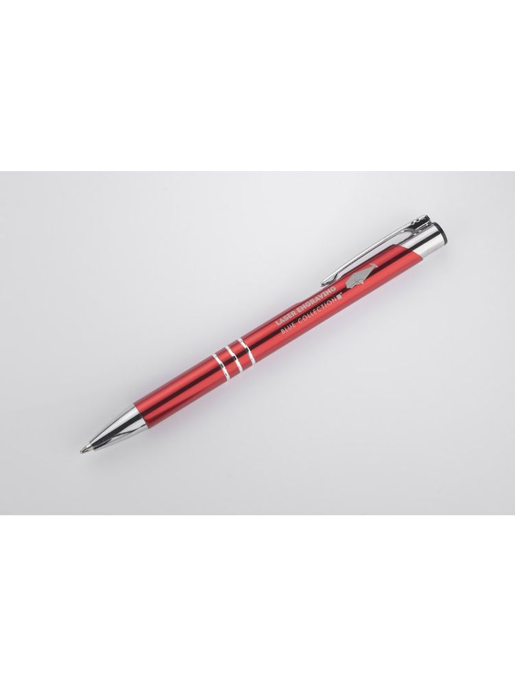 Metalowy długopis o metalizowanej chromowanej powierzchni. Długopis automatyczny z 3 ringami i niebieskim wkładem. Logo grawerujemy na powierzchni długopisu.
