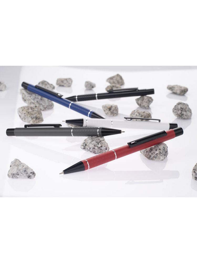 Długopis SATO łączy w sobie niezawodność, piękno i funkcjonalność. Wykonany jest z lekkiego aluminium, a czarne wykończenie nadaje mu elegancji i prestiżu, sprawiając, że doskonale sprawdzi się jako produkt reklamowy w każdej branży. Korpus długopisu został ozdobiony dwoma srebrnymi ringami oraz paskami o delikatnie chropowatej strukturze, dodając mu przyjemnie sensorycznego wymiaru. Wkład z tuszem pół żelowym zapewnia niesamowicie gładkie i płynne pisanie. Grubość linii 0,7 mm pozwoli użytkownikom cieszyć się wyjątkowo precyzyjnymi notatkami, podkreśleniami i listami.