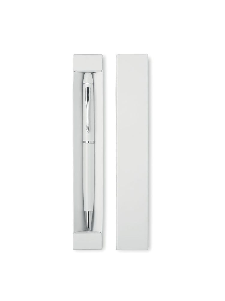 Przekręcany długopis wykonany z aluminium z miękką końcówką do ekranów dotykowych. Niebieski tusz. Indywidualnie pakowany w kartonik.