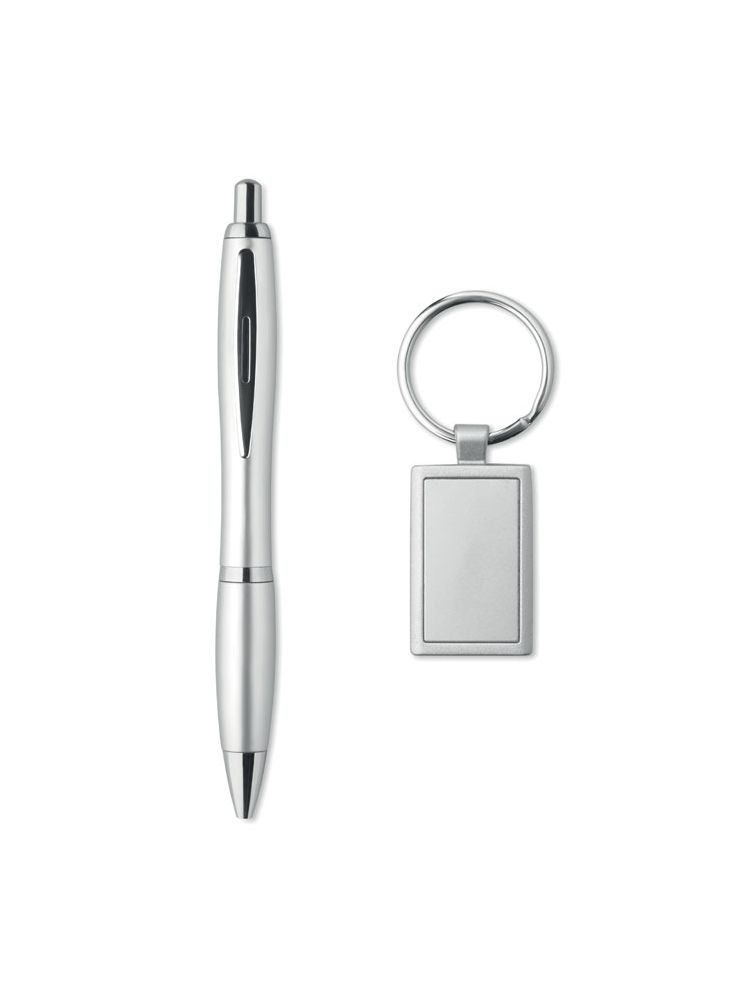 Atrakcyjny prezent. Plastikowy przekręcany długopis z metalicznym wykończeniem i aluminiowy brelok z dobraną kolorystycznie płytką na logo. Czarne kartonowe pudełko. Niebieski wkład.