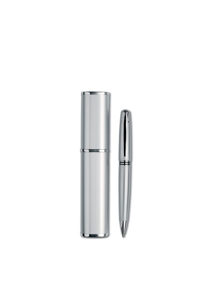 Metalowy przekręcany długopis w aluminiowym pudełku. Metalowy wkład z czarnym tuszem.