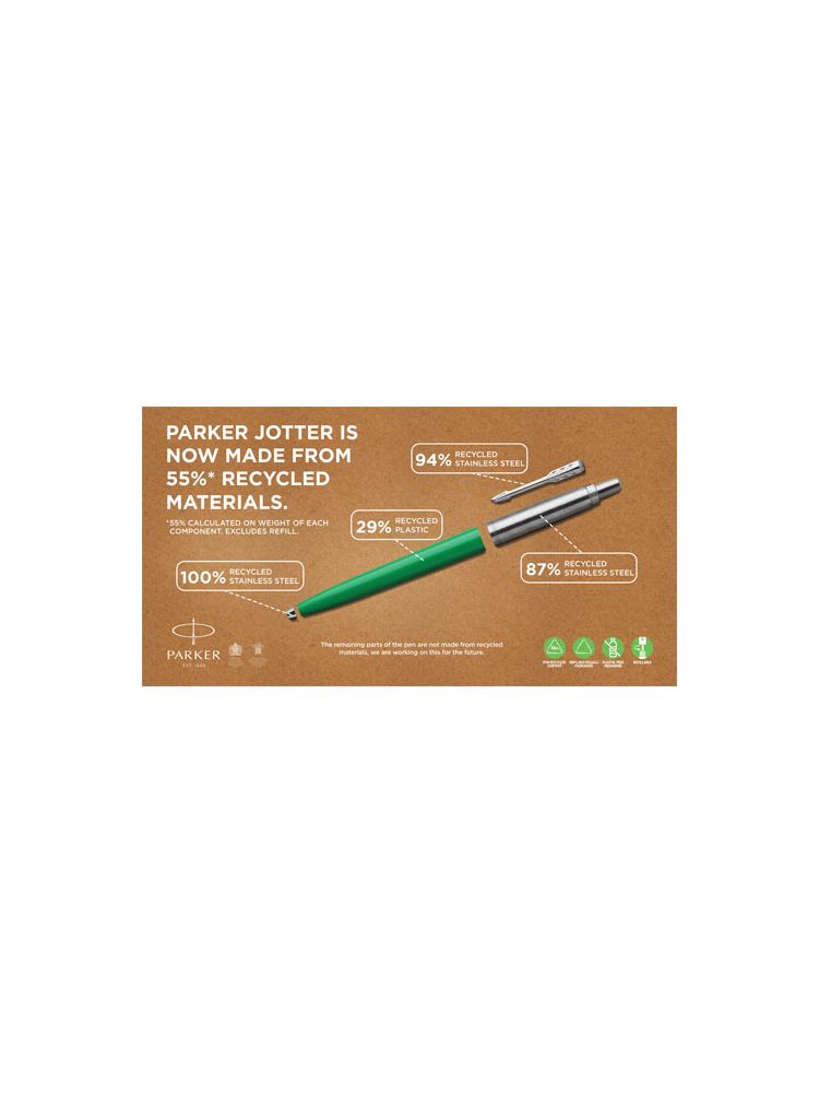 Długopis Parker Jotter Recycled jest ekologiczny, stylowy i zapewnia doskonałe działanie w przystępnej cenie. Odporna na zarysowania obudowa z tworzyw sztucznych pochodzących z recyklingu łączy elegancję z trwałością. Zawiera wkład Parker Quinkflow® zapewniający płynne pisanie tekstów o długości 3500–5500 metrów. Pierścień wykończeniowy wykonany ze stali nierdzewnej z recyklingu podkreśla jego przyjazność dla środowiska. Długopis kulkowy Jotter z recyklingu idealnie nadaje się dla osób z ograniczonym budżetem i świadomością ekologiczną, które szukają stylowego i przyjaznego dla środowiska przyboru do pisania. Czarny tusz.