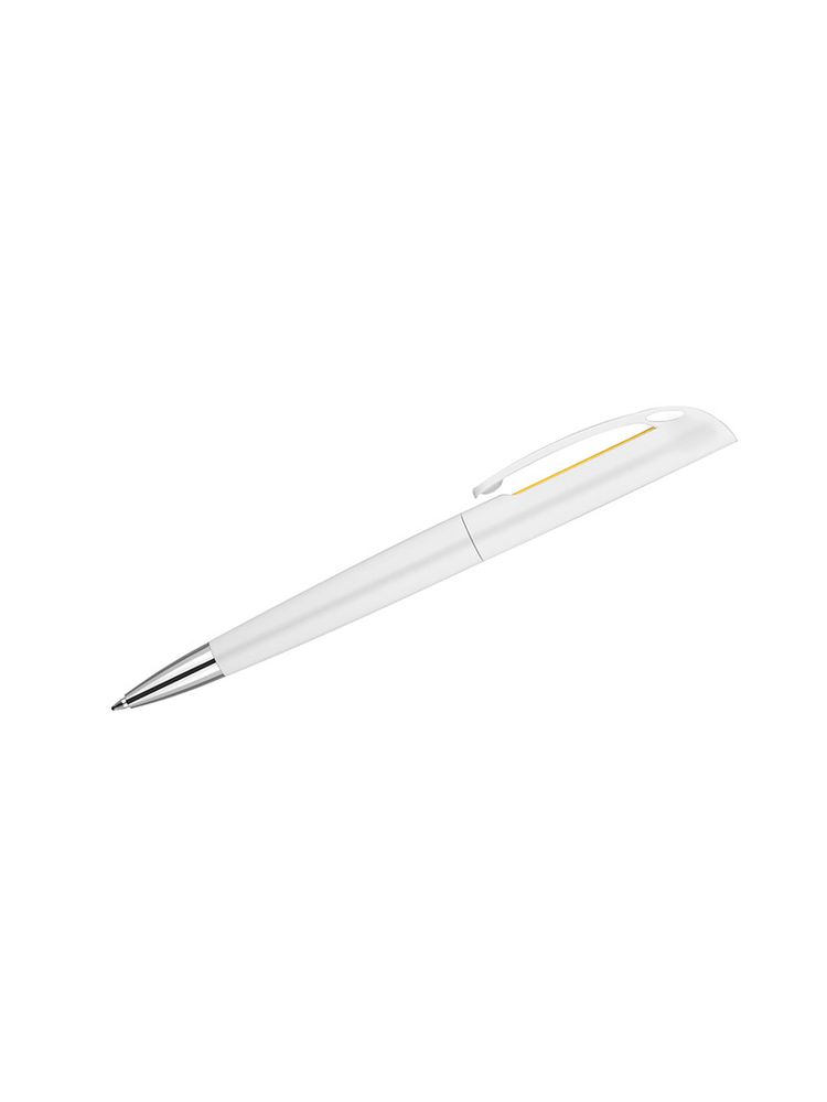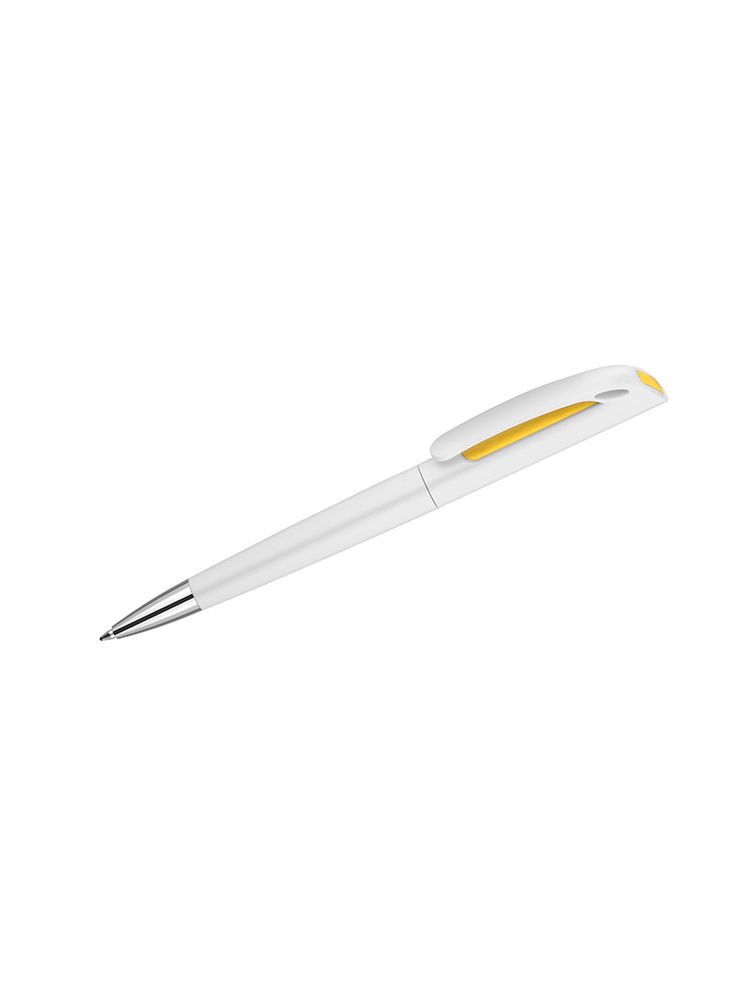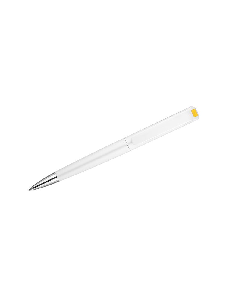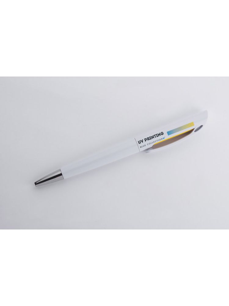 INTER to klasyczny długopis z tworzywa sztucznego. Korpus w białym kolorze z kolorowym zdobieniem pod klipem. Długopis typu twist. Wkład o grubości 0,7 mm w kolorze niebieskim.