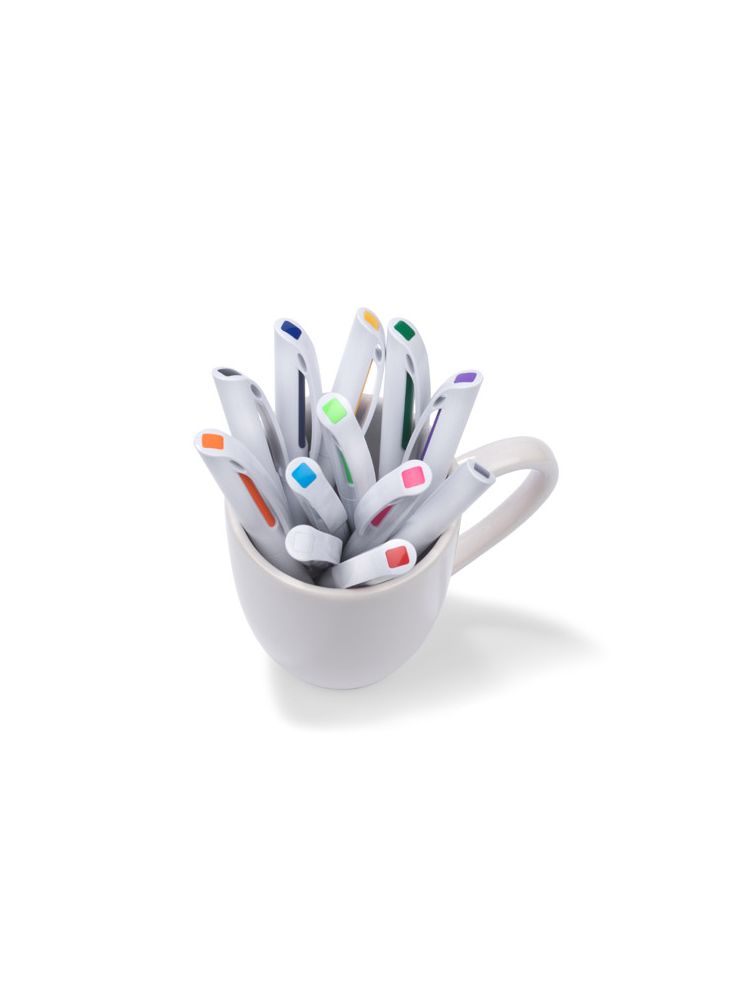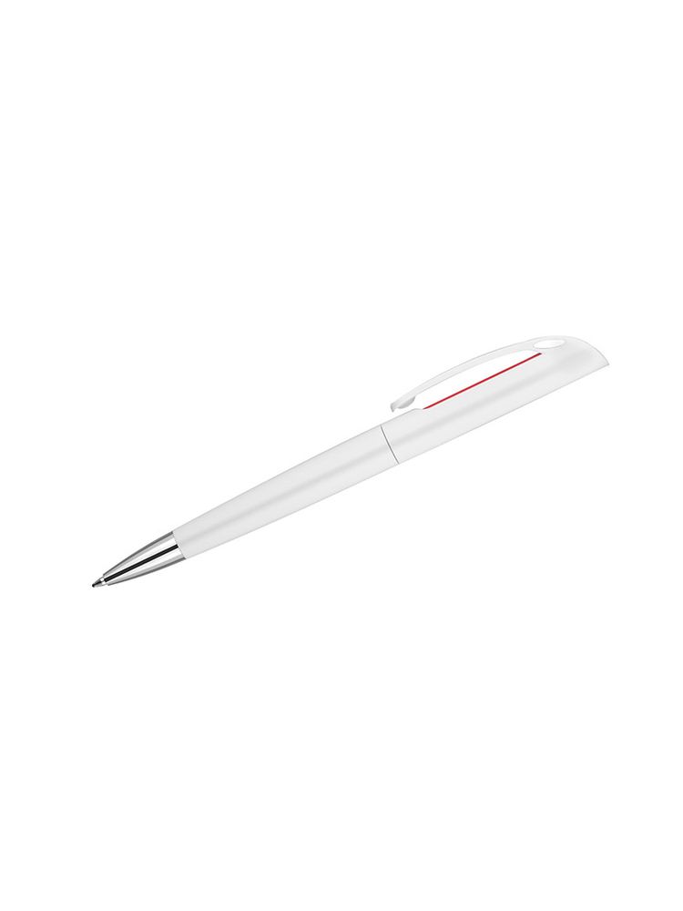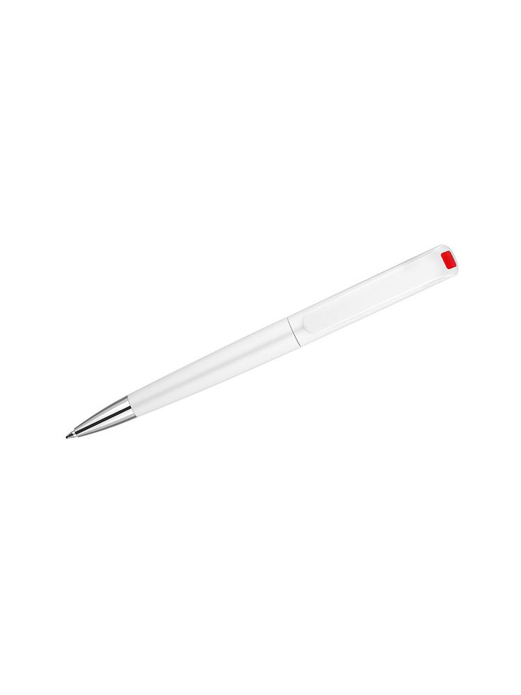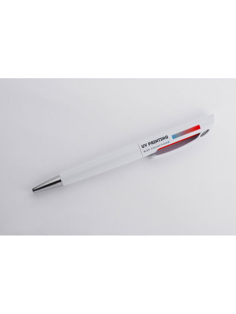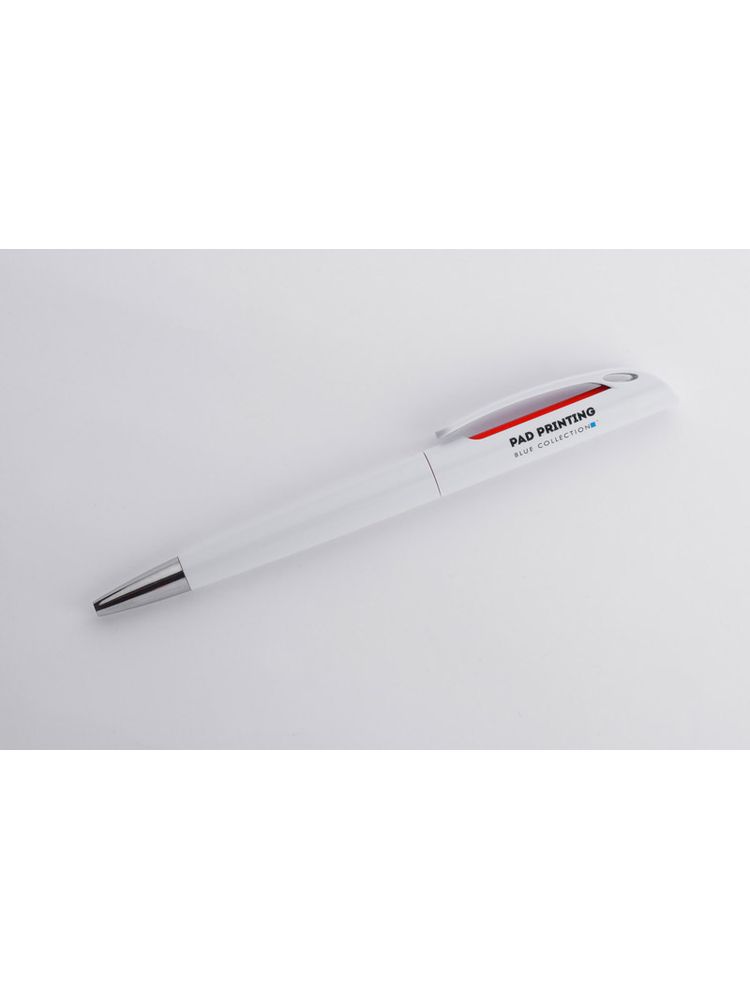 INTER to klasyczny długopis z tworzywa sztucznego. Korpus w białym kolorze z kolorowym zdobieniem pod klipem. Długopis typu twist. Wkład o grubości 0,7 mm w kolorze niebieskim.